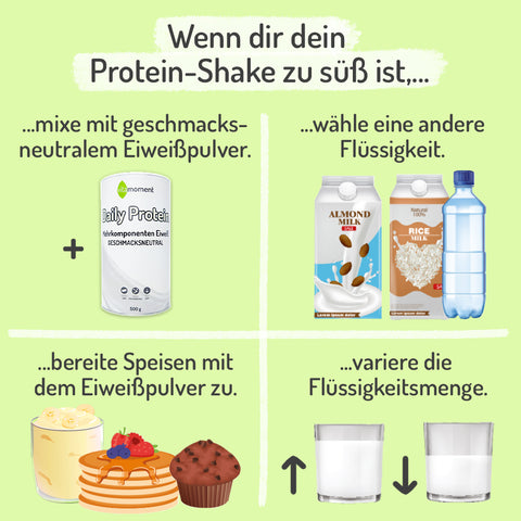 Du kannst insgesamt die gleiche Menge an Eiweißpulver wie sonst auch nehmen, aber teilst sie in je einen Anteil Daily Protein Shake deiner Geschmacksrichtung und den anderen Anteil Daily Protein Shake Geschmacksneutral, zum Beispiel: