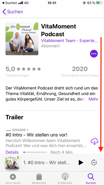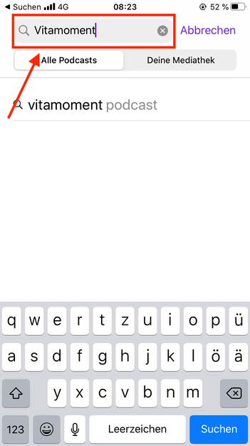 Schritt 1: Öffne die Podcast-App und suche oben links mit der Lupe nach dem VitaMoment-Podcast und öffne ihn