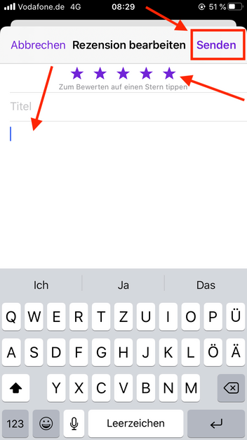 Schritt 3: Nun kannst du Sterne an uns vergeben und uns damit bewerten und dein ehrliches Feedback da lassen. Dann nur noch oben rechts auf „Senden“ klicken und du bist schon fertig!