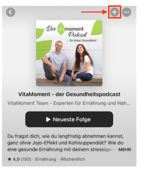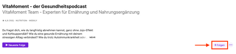 Apple hat auf seinen Geräten bereits die kostenfreie App „Podcasts“ vorinstalliert, in der du uns ganz einfach hören kannst. Mach dich gerne einmal auf die Suche nach der App – es lohnt sich! Wenn du in der App bist, kannst du auf die Lupe klicken und nach dem Begriff „VitaMoment Podcast“ suchen. Wenn du ab sofort immer auf dem neusten Stand sein möchtest und keine neue Folge mehr verpassen willst, klicke rechts neben dem Bild auf den Button „Abonnieren“.