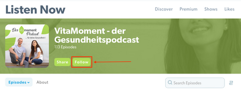 Schritt 2: Klicke auf “Follow”. Der Podcast ist nun in deiner Mediathek gespeichert.