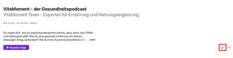 Schritt 2: Klicke oben rechts auf das +, sodass ein Häkchen erscheint. Der Podcast ist nun in deiner Mediathek gespeichert.