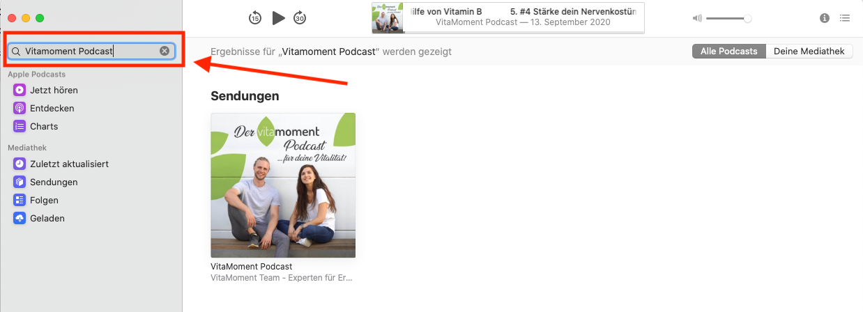Schritt 1: Öffne die Podcasts App auf deinem Desktop und gib oben Links in der Suche „Vitamoment Podcast“ ein.
