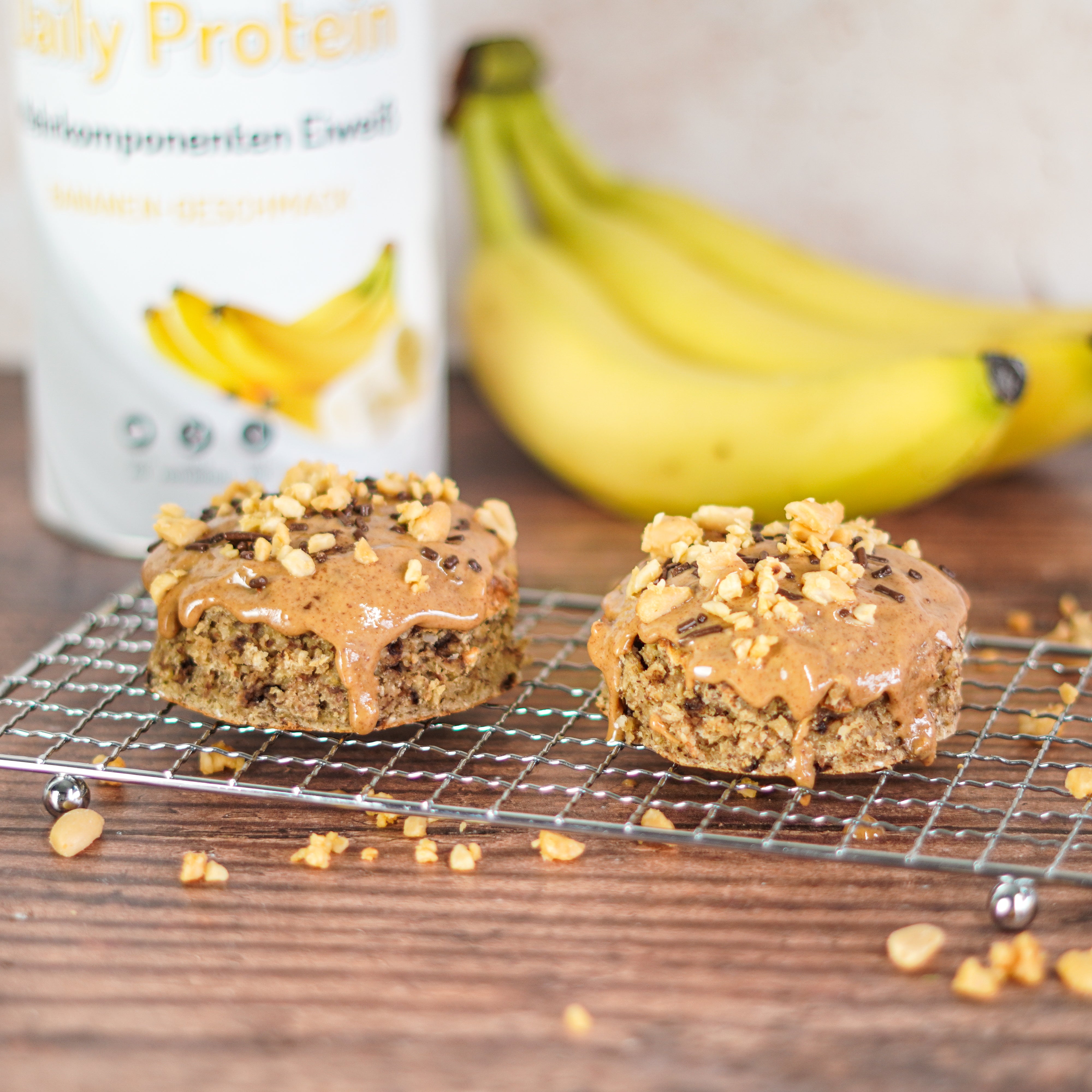 6Küchlein abkühlen lassen & wahlweise mit Erdnussmus, gehackten Erdnüssen & einigen Schokostreuseln garnieren.