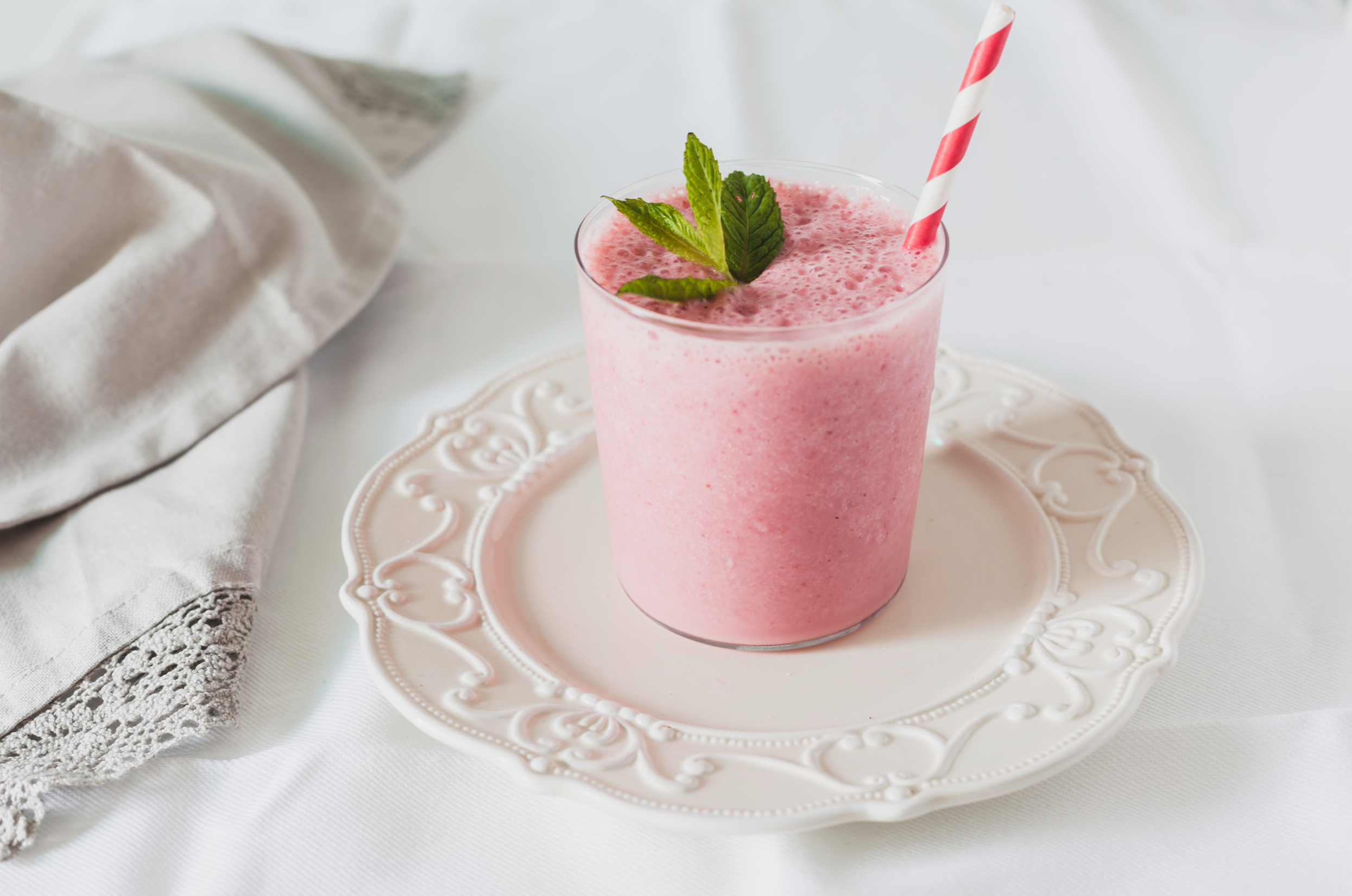 4Smoothie in ein Glas füllen und mit etwas Minze garnieren.