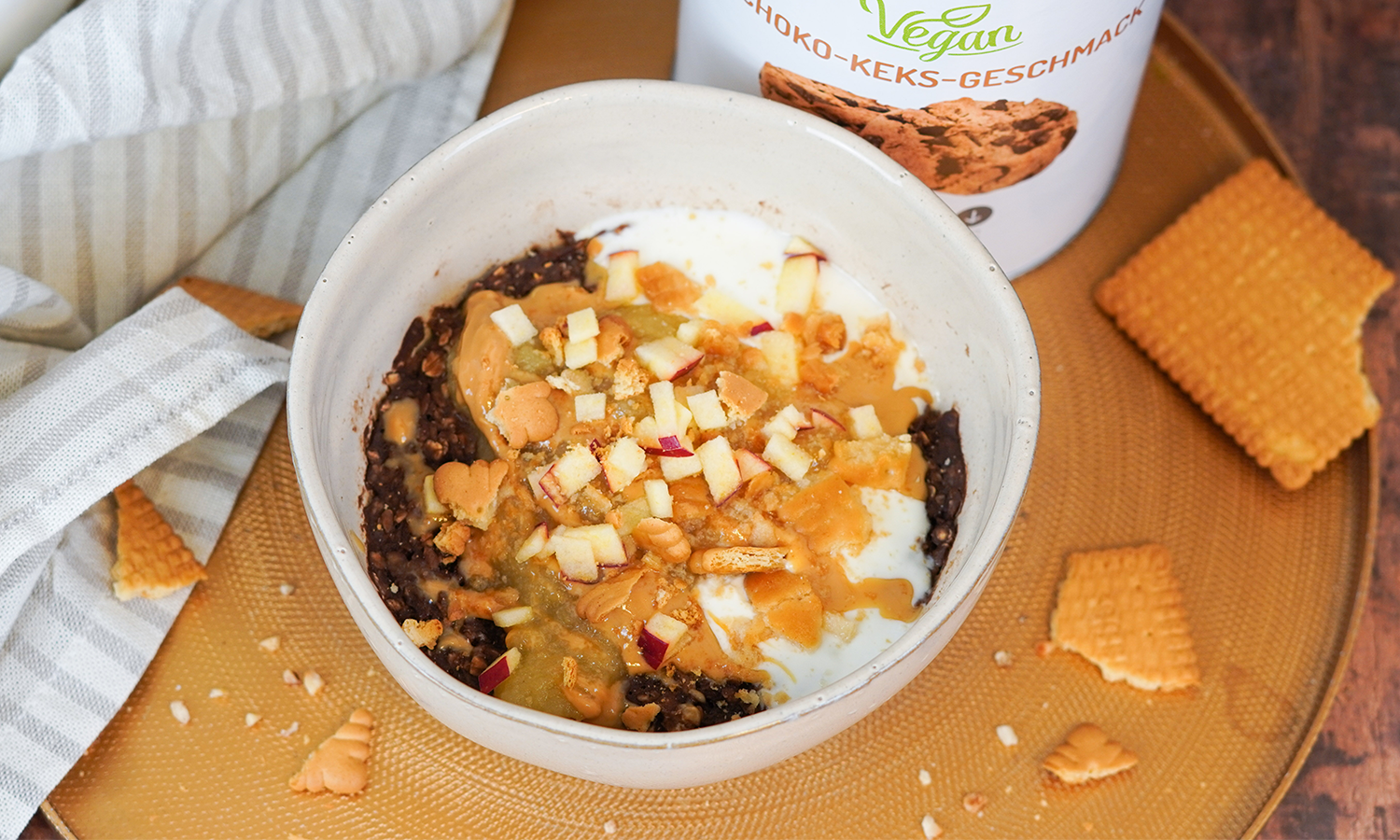 4Einen Keks zerbröseln und als Topping mit dem Soja-Joghurt und dem Apfelmark auf die Bowl verteilen.