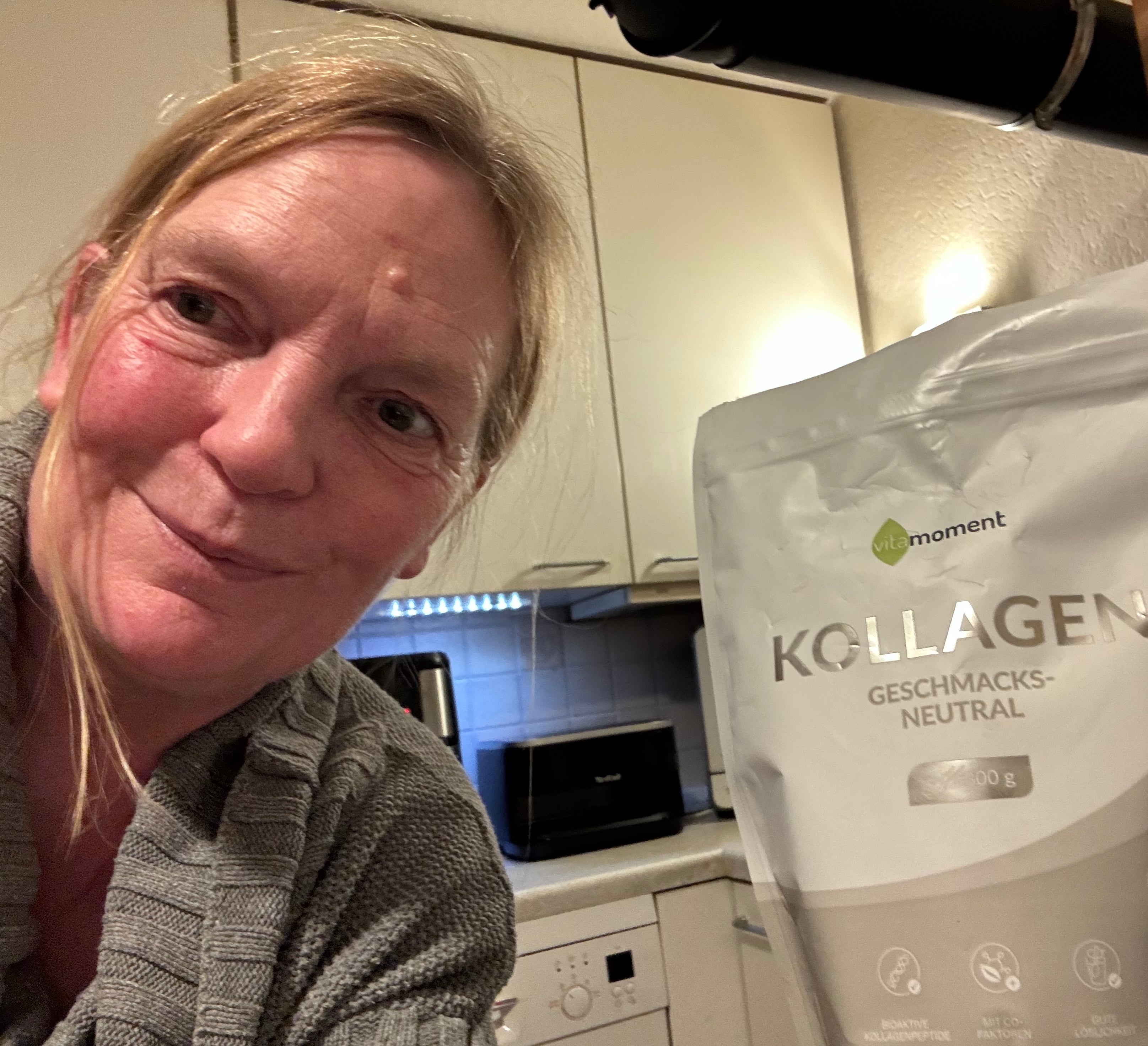Ich nehme das Kollagen, weil es für Knochen, Gewebe und alles gut ist. Der schöne Nebeneffekt: Meine Haut ist besser geworden und meine Nägel sind nicht mehr so brüchig. Ich trinke es abends wie einen Tee, mit Magnesium drin, was meinen Schlaf und die Regeneration nachts fördert.