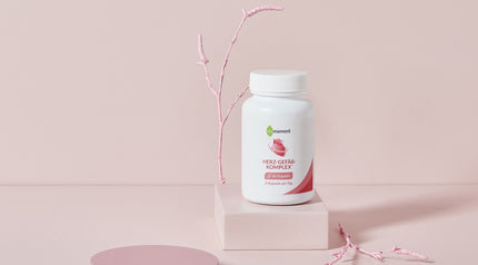 Mit unserem VitaMoment Herz-Gefäß-Komplex erhältst du eine rein natürliche Lösung, um die Gesundheit deines Herzens und deiner Blutgefäße ganz aktiv zu unterstützen. Mit der Kombination hochwertiger, pflanzlicher Extrakte aus Granatapfel und Weißdorn kannst du der Entstehung von Herz-Kreislauf-Erkrankungen, wie Atherosklerose, entgegenwirken. Sie wirken zudem antioxidativ, können die Körperzellen vor freien Radikalen schützen und sich positiv auf den Blutdruck auswirken. Darüber hinaus unterstützen Eisen sowie die Vitamine C, B1, B2, B6, B, B12 und K die Blutbildung und tragen zu einer normalen Blutgerinnung bei.
