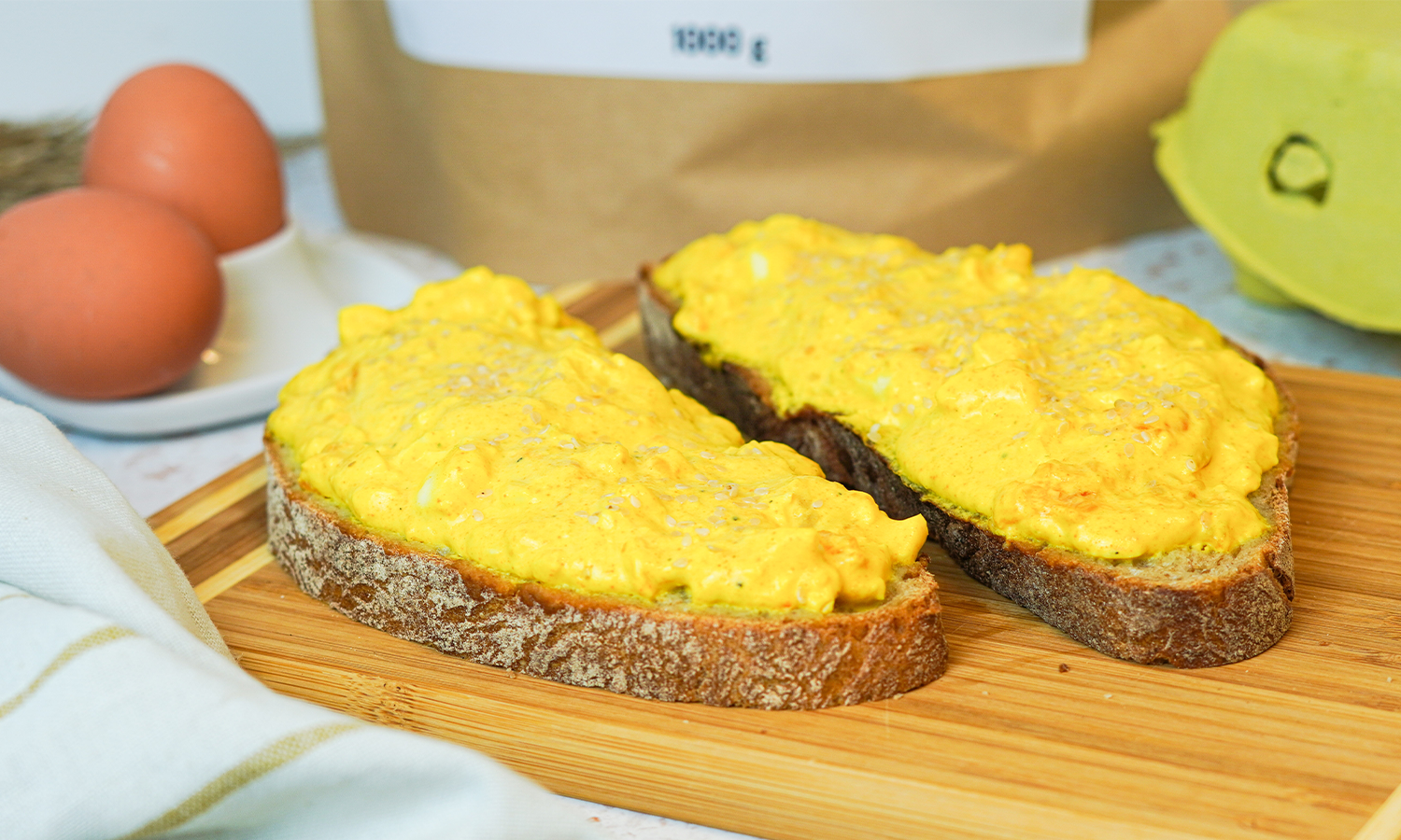 Dieser Eiersalat ohne Mayo ist schnell zubereitet und schmeckt fabelhaft auf einer knusprigen Stulle. Kurkuma und Sesam runden den Geschmack ab.