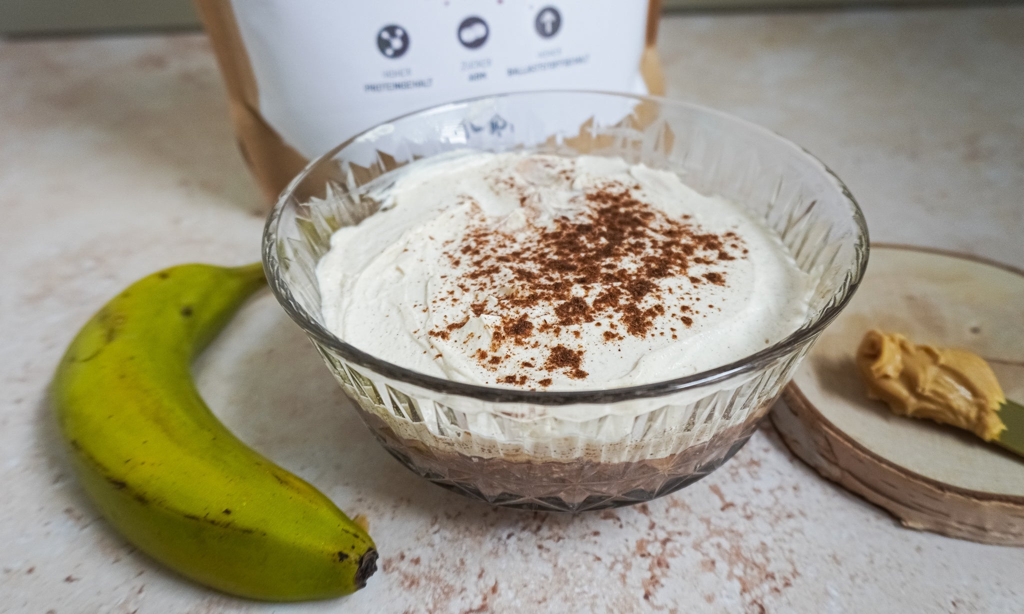 4Erdnuss-Quark und Banane als Topping auf das Porridge geben und warm genießen.
