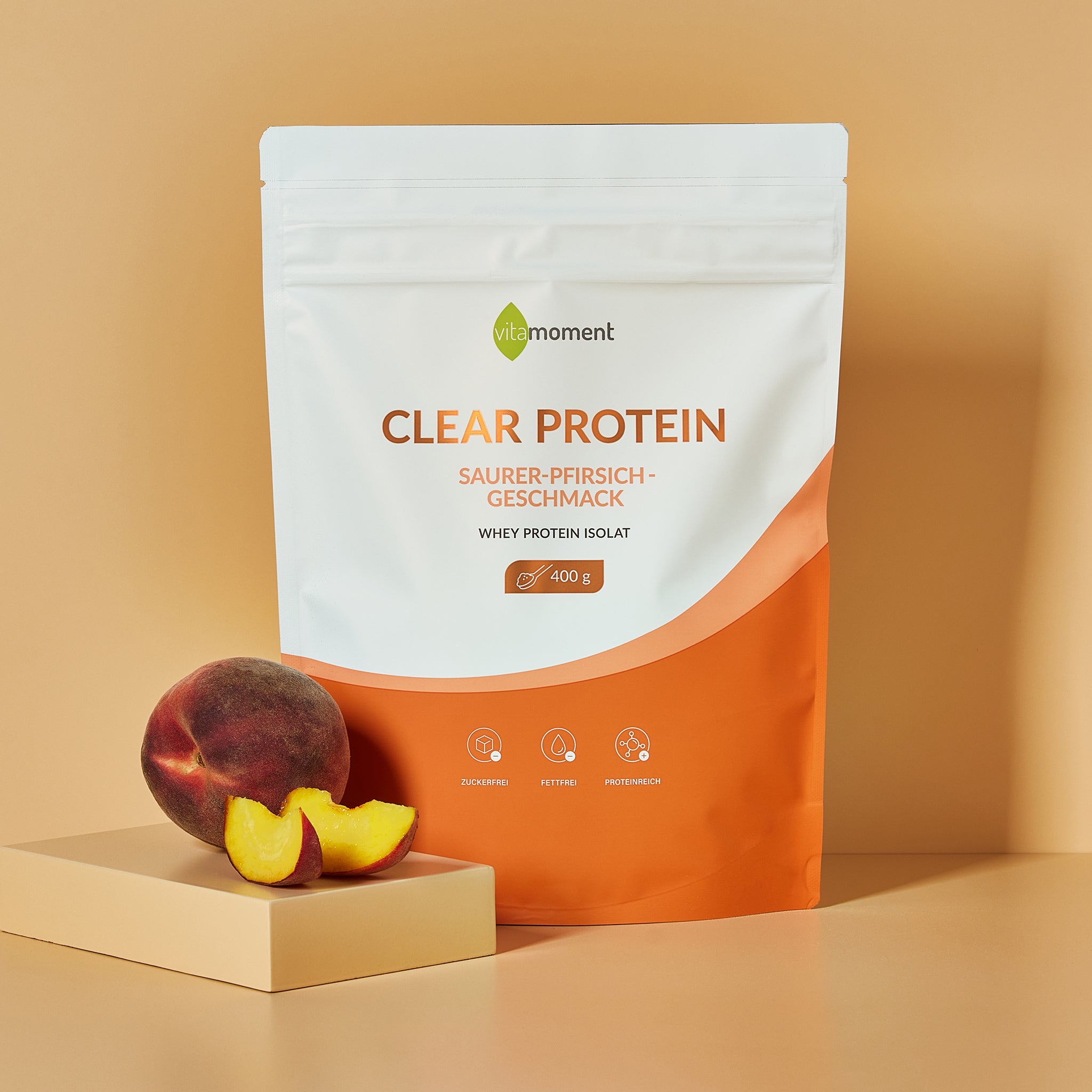 Stell dir vor, du genießt einen eiskalten Schluck Pfirsich-Limo an einem heißen Sommertag – leicht, spritzig und unglaublich erfrischend. Genau so schmeckt unser Clear Protein Saurer Pfirsich. Nur mit einem Unterschied: Du versorgst deinen Körper dabei gleichzeitig mit hochwertigem Eiweiß.