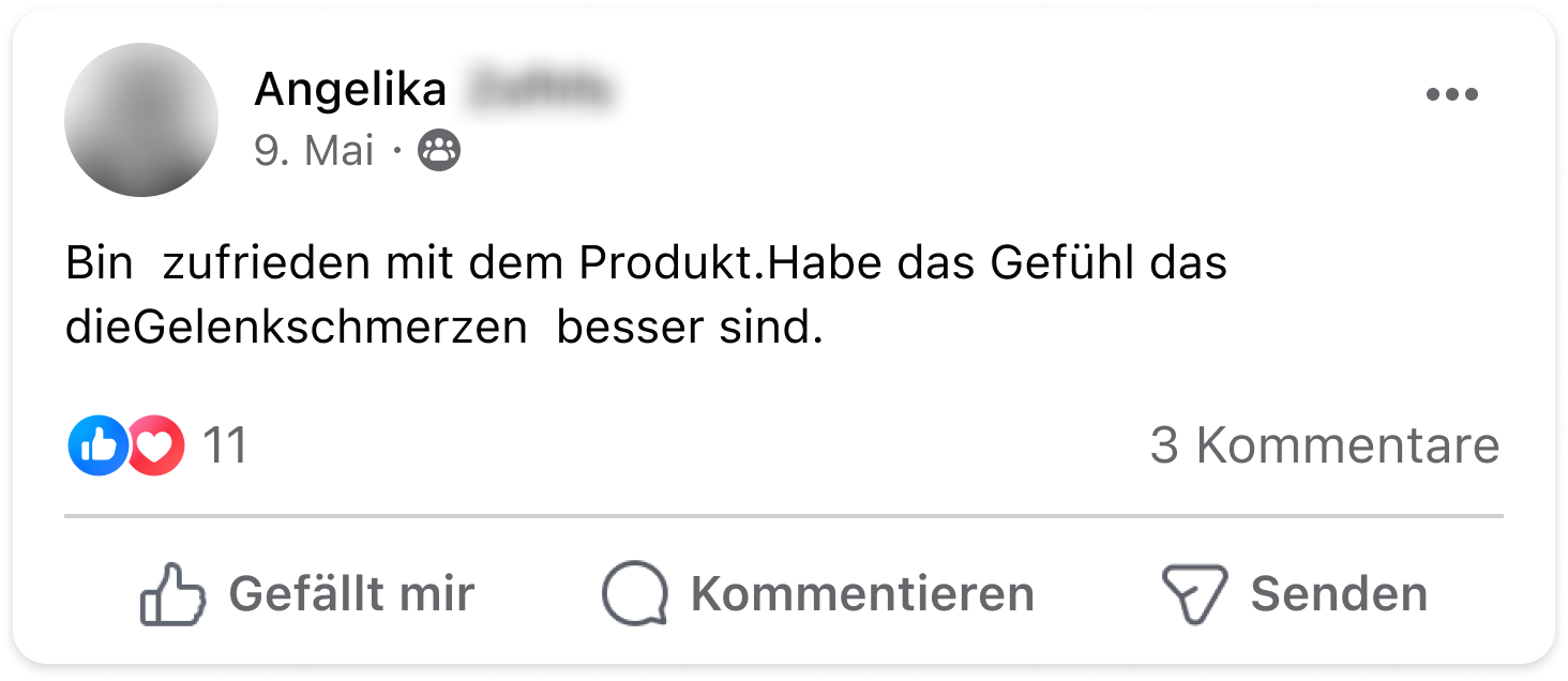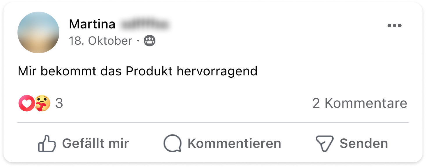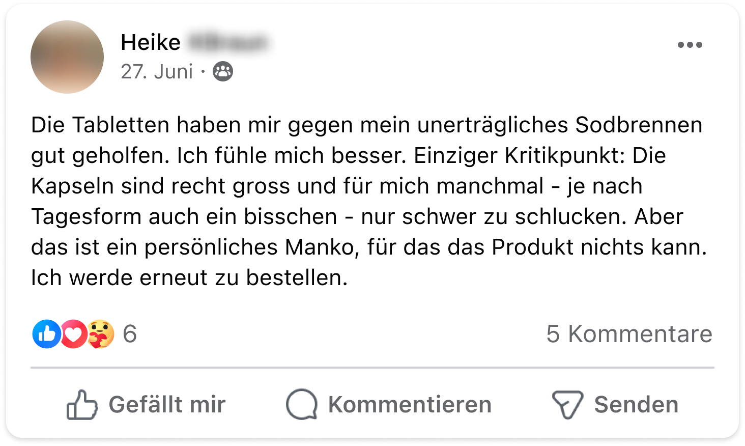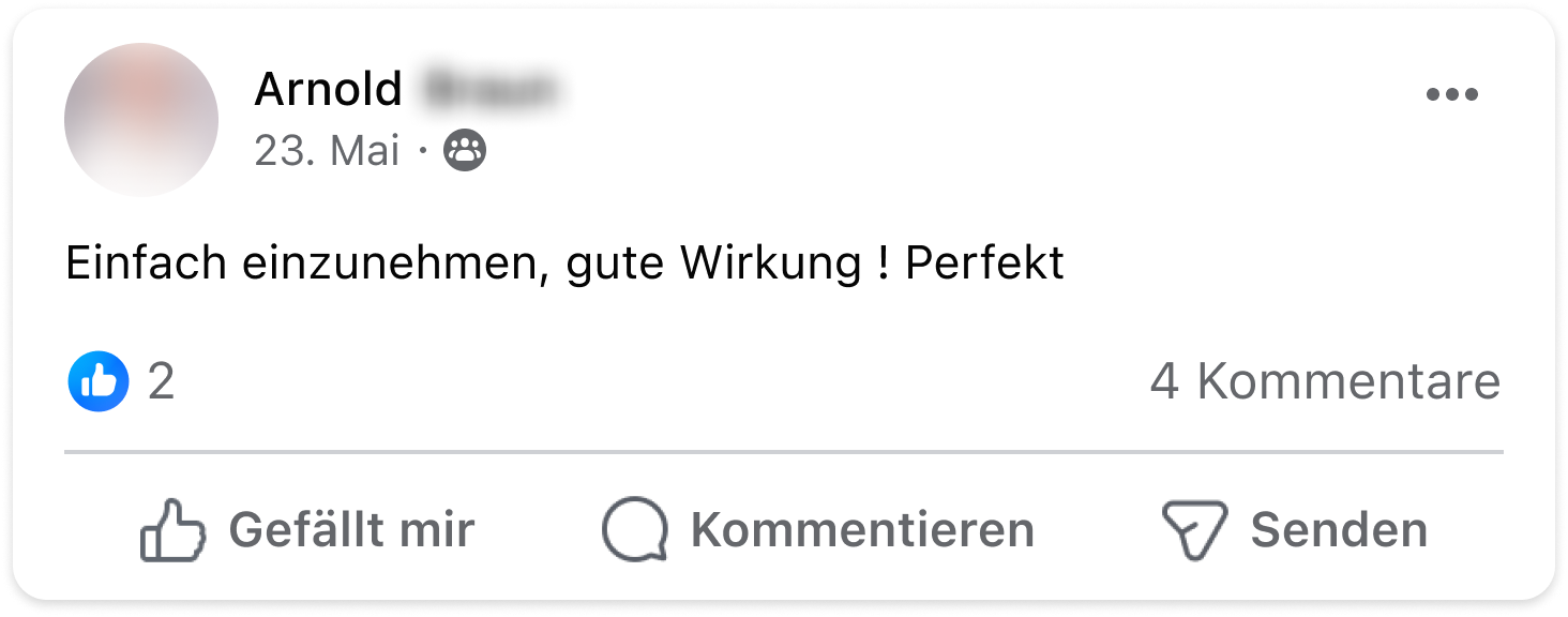 Disclaimer: Dieses Produkt ist nicht zur Diagnose, Behandlung, Heilung von oder zur Vorbeuge vor Krankheiten bestimmt. Die Ergebnisse können variieren / sind eventuell nicht typisch. Bewertungen oder Testimonials sind individuelle Erfahrungsberichte unserer Kunden. Diese Informationen stellen keine medizinische Beratung dar und dürfen auch nicht als eine solche verstanden werden. Sprich bitte mit deinem Arzt, bevor du dein regelmäßiges, ärztlich vorgeschriebenes Behandlungsverfahren änderst. Nahrungsergänzungsmittel sind kein Ersatz für eine ausgewogene und abwechslungsreiche Ernährung und eine gesunde Lebensweise. Das Bildmaterial unserer Kundenfeedbacks wurde aus Gründen des Persönlichkeitsrechts z.T. lizensiert erworben und entspricht nicht immer dem echten Erscheinungsbild.