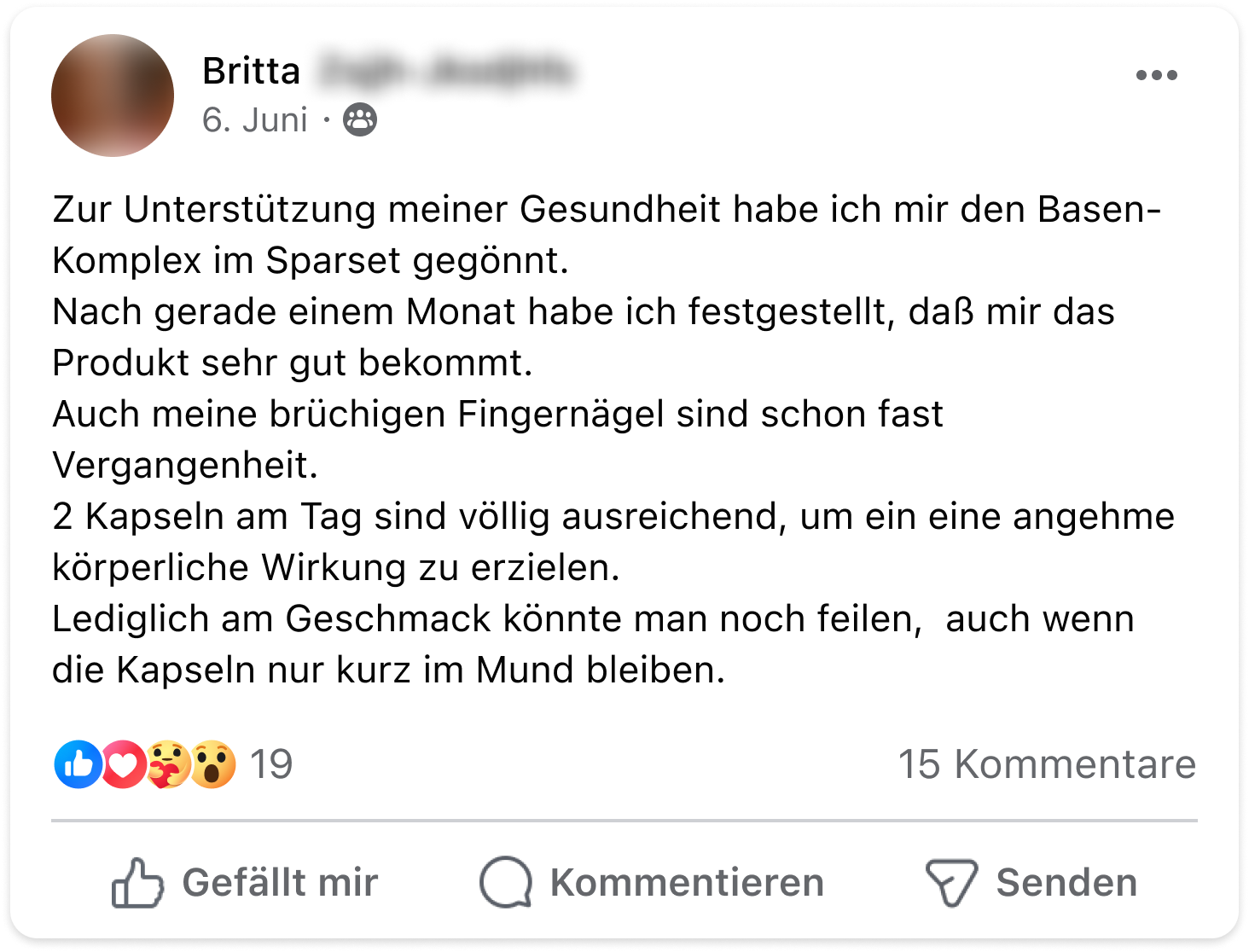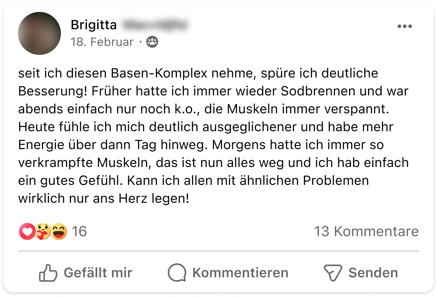 Ich hatte letztes Jahr starke Probleme mit Gastritis. Trotz Säureblockern blieben Beschwerden wie Sodbrennen, Müdigkeit und Magenschmerzen. Auf der Suche nach einer natürlichen Lösung stieß ich auf einen Produkttest, in dem der Basen-Komplex Platz 1 belegte. Schon nach dem ersten Monat war mein starkes morgendliches Hungergefühl und die Magenbeschwerden verschwunden. Seitdem fühle ich mich viel besser, freier und energiegeladener. Preis-Leistung, Qualität und Kundenservice überzeugen mich komplett – deshalb nehme ich den Basen-Komplex weiter und empfehle ihn auch in meiner Familie. Einfach top!