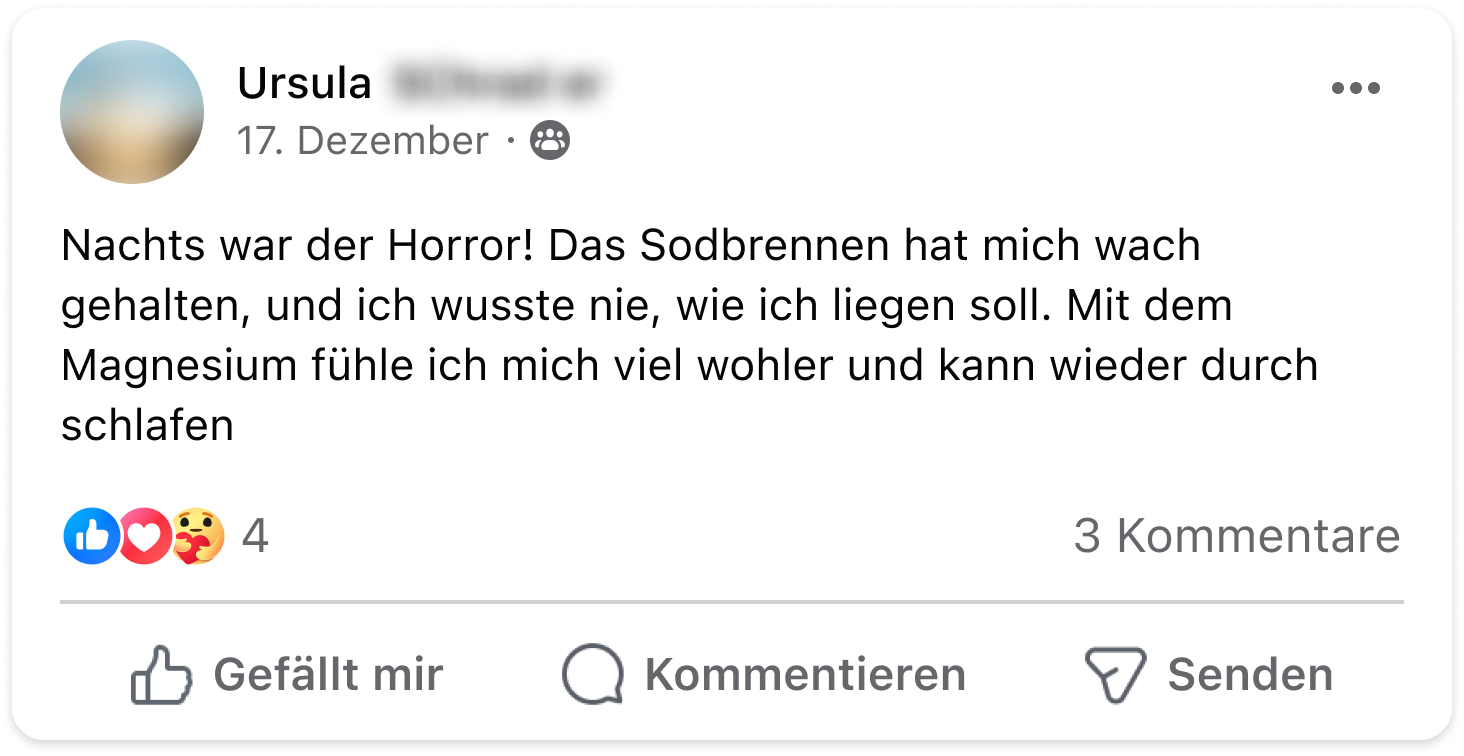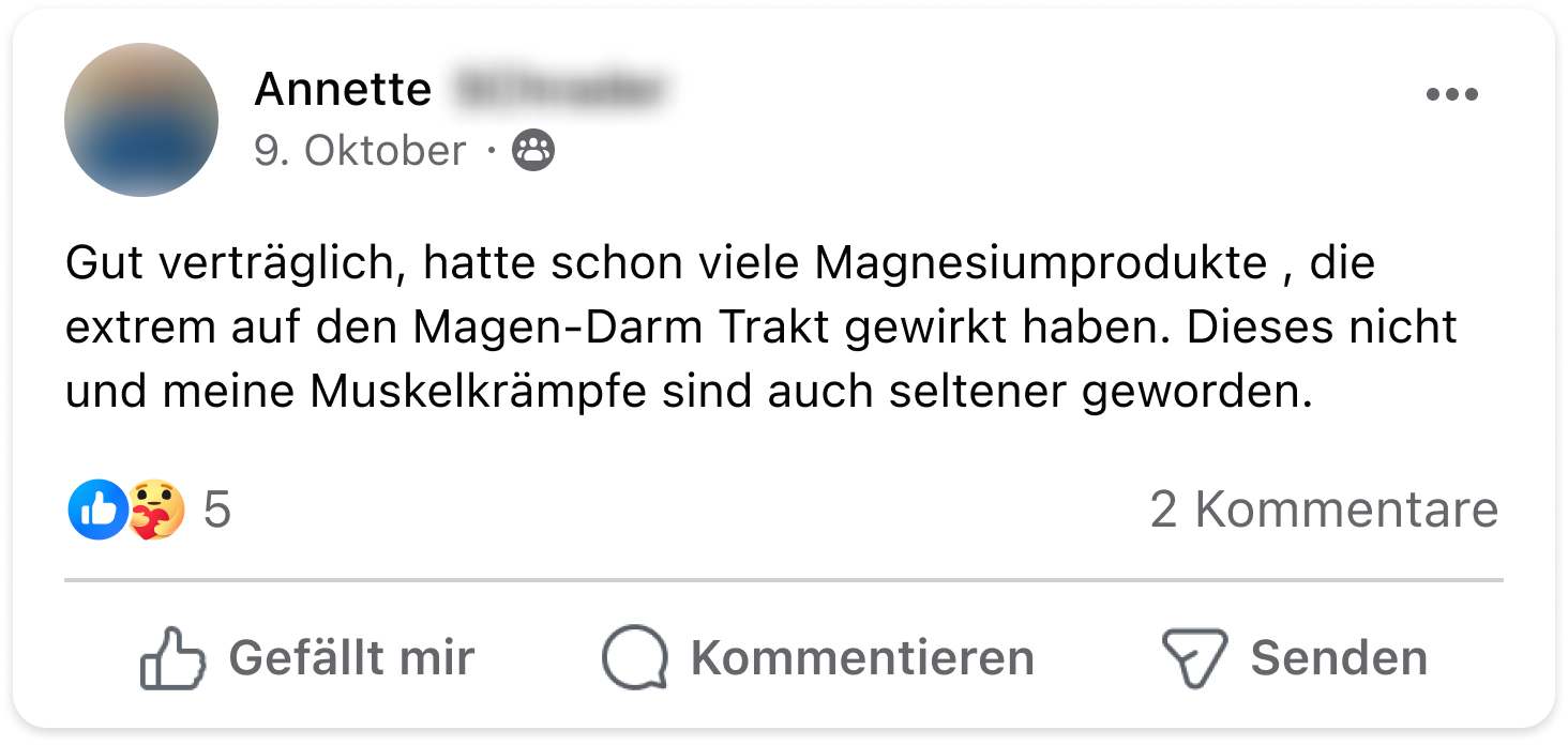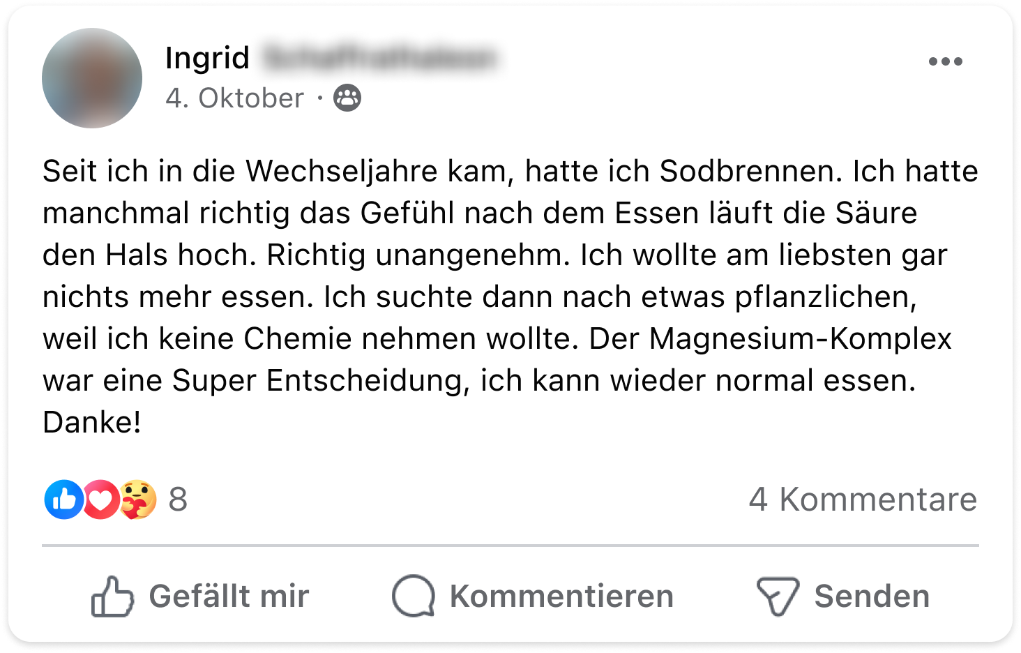 Eine stressige Lebensphase brachte Verdauungsprobleme, die mich sehr belasteten. Knapp eine Woche nach der ersten Einnahme von Magnesium hatte ich keine Schmerzen mehr, meine Verdauung rund um Magen und Darm hatte sich beruhigt und fühle mich wieder richtig fit.