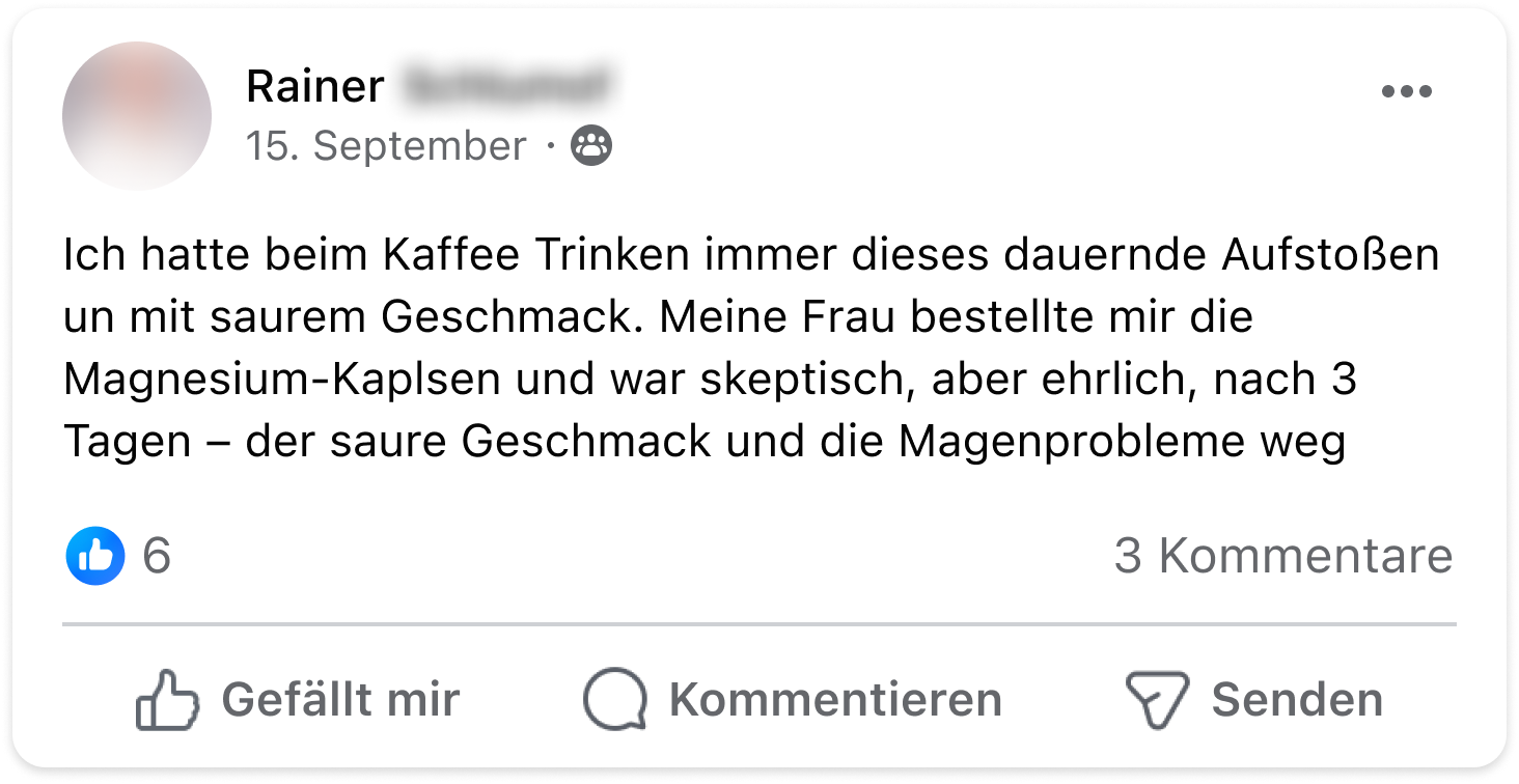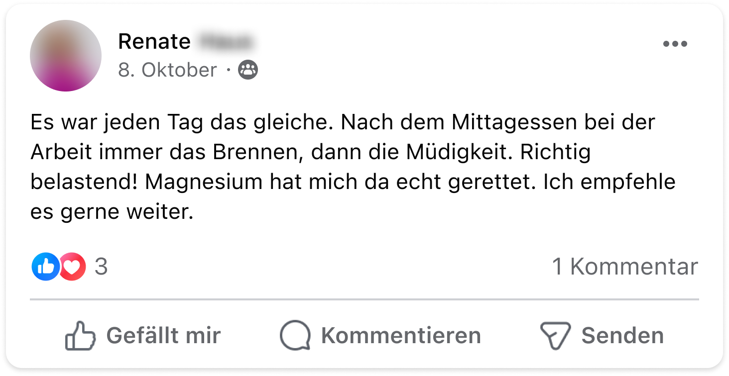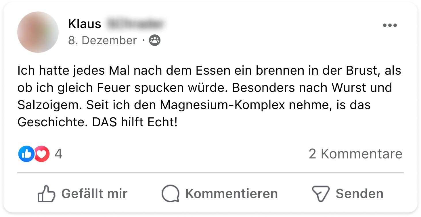 Eine stressige Lebensphase brachte Verdauungsprobleme, die mich sehr belasteten. Knapp eine Woche nach der ersten Einnahme von Magnesium hatte ich keine Schmerzen mehr, meine Verdauung rund um Magen und Darm hatte sich beruhigt und fühle mich wieder richtig fit.