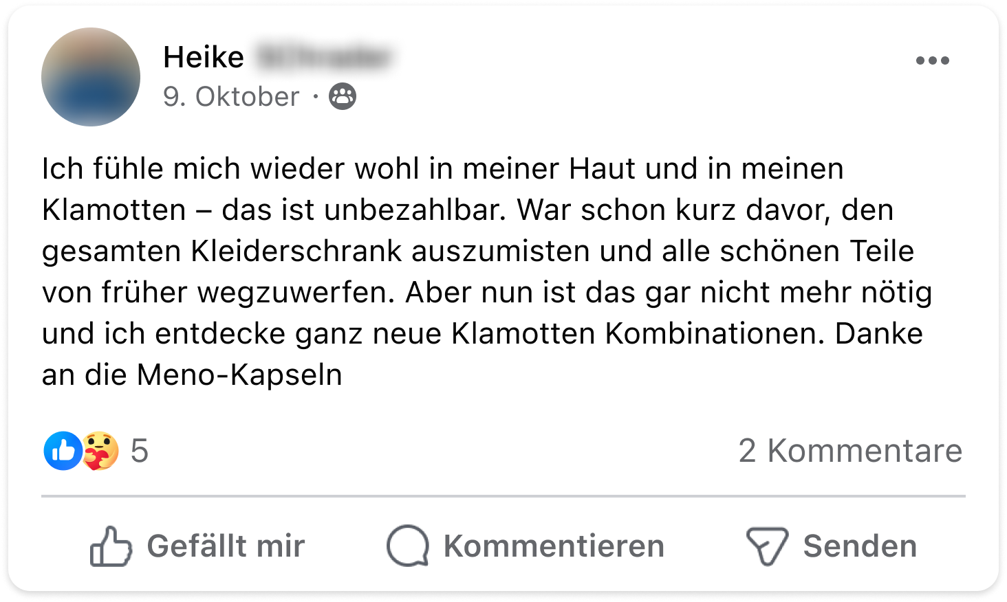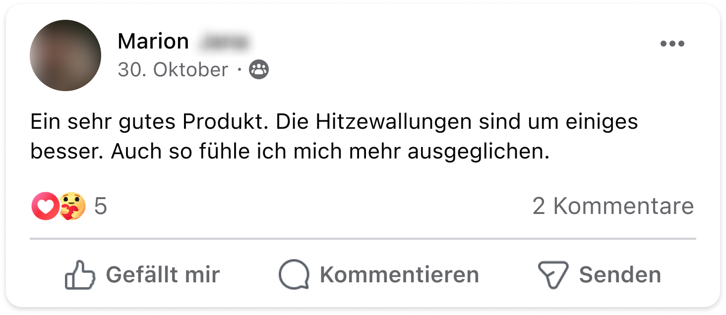 Kaum war ich 50, überrollten mich Schlafstörungen, Schlappheit, Antriebslosigkeit und natürlich auch Hitzewallungen. Mit dem Meno-Komplex hat sich die Stärke von allem sehr minimiert. Das ist so viel mehr Lebensqualität. 😊 Und wenn ich das Präparat heute einmal weglasse, weil ich wegfahre und es vergessen habe, dann merke ich das total.