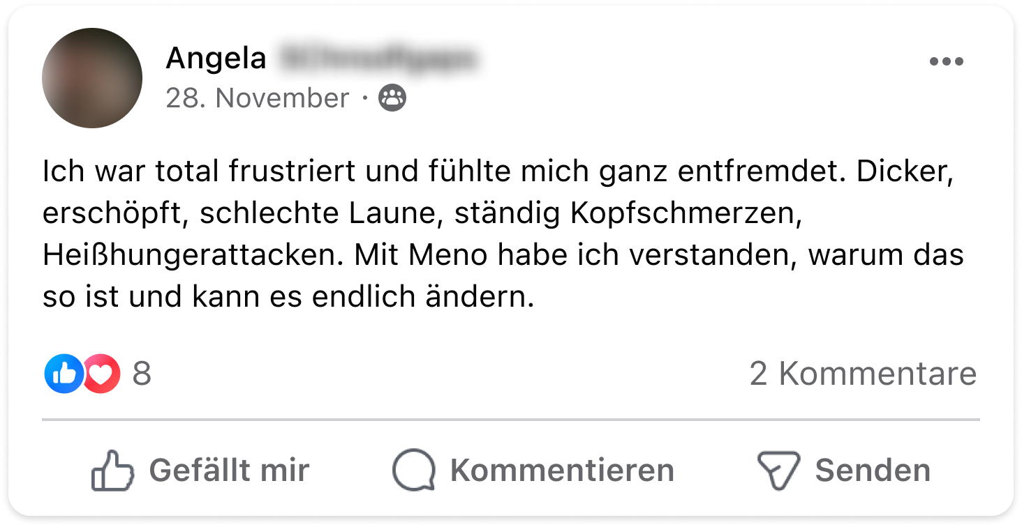 Vor einem Jahr fingen bei mir starke Wechseljahresbeschwerden an – Hitzewallungen, Schlafstörungen und Stimmungsschwankungen. Nach erfolglosen Versuchen mit natürlichen Mitteln stieß ich auf den Meno-Komplex von VitaMoment und probierte ihn aus. Zunächst verschlimmerten sich die Symptome, aber nach anderthalb Wochen ging es mir deutlich besser. Die Hitzewallungen und Schlafprobleme verschwanden, und meine Lebensqualität stieg. Ich kann den Meno-Komplex nur empfehlen!