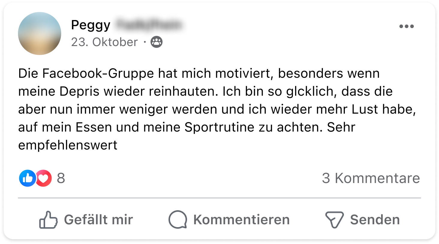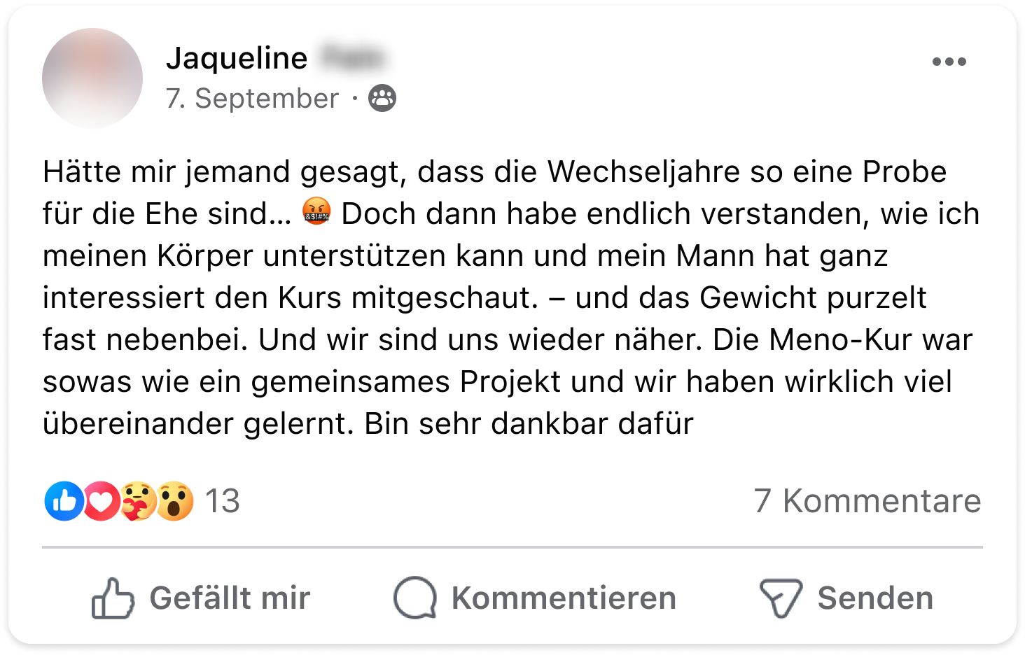 Ich hätte es nicht für möglich gehalten, aber meine Hitzewallungen und Stimmungsschwankungen sind praktisch weg. Ich fühle mich so viel besser! Das Handbuch und das Video-Coaching halfen mir sehr, meine Beschwerden besser zu verstehen. Das kann ich wirklich nur jeder Frau in den Wechseljahren ans Herz legen. 🤩