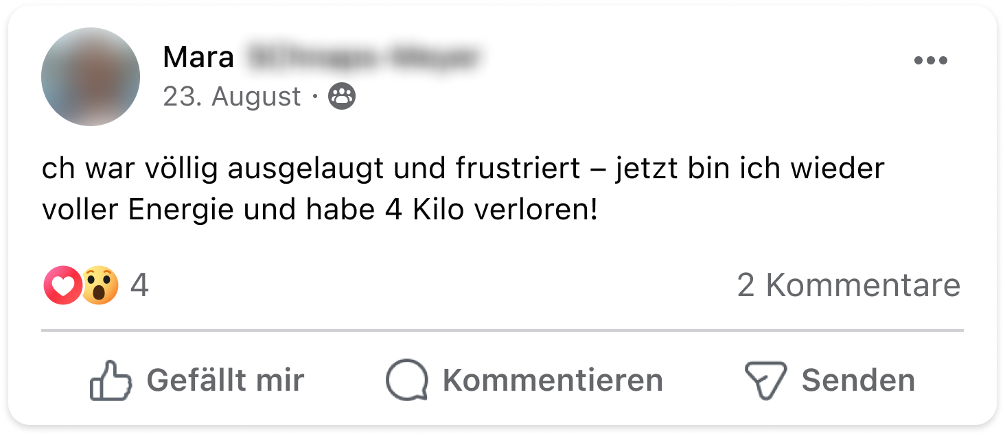 Disclaimer: Dieses Produkt ist nicht zur Diagnose, Behandlung, Heilung von oder zur Vorbeuge vor Krankheiten bestimmt. Die Ergebnisse können variieren / sind eventuell nicht typisch. Bewertungen oder Testimonials sind individuelle Erfahrungsberichte unserer Kunden. Diese Informationen stellen keine medizinische Beratung dar und dürfen auch nicht als eine solche verstanden werden. Sprich bitte mit deinem Arzt, bevor du dein regelmäßiges, ärztlich vorgeschriebenes Behandlungsverfahren änderst. Nahrungsergänzungsmittel sind kein Ersatz für eine ausgewogene und abwechslungsreiche Ernährung und eine gesunde Lebensweise. Das Bildmaterial unserer Kundenfeedbacks wurde aus Gründen des Persönlichkeitsrechts z.T. lizensiert erworben und entspricht nicht immer dem echten Erscheinungsbild.