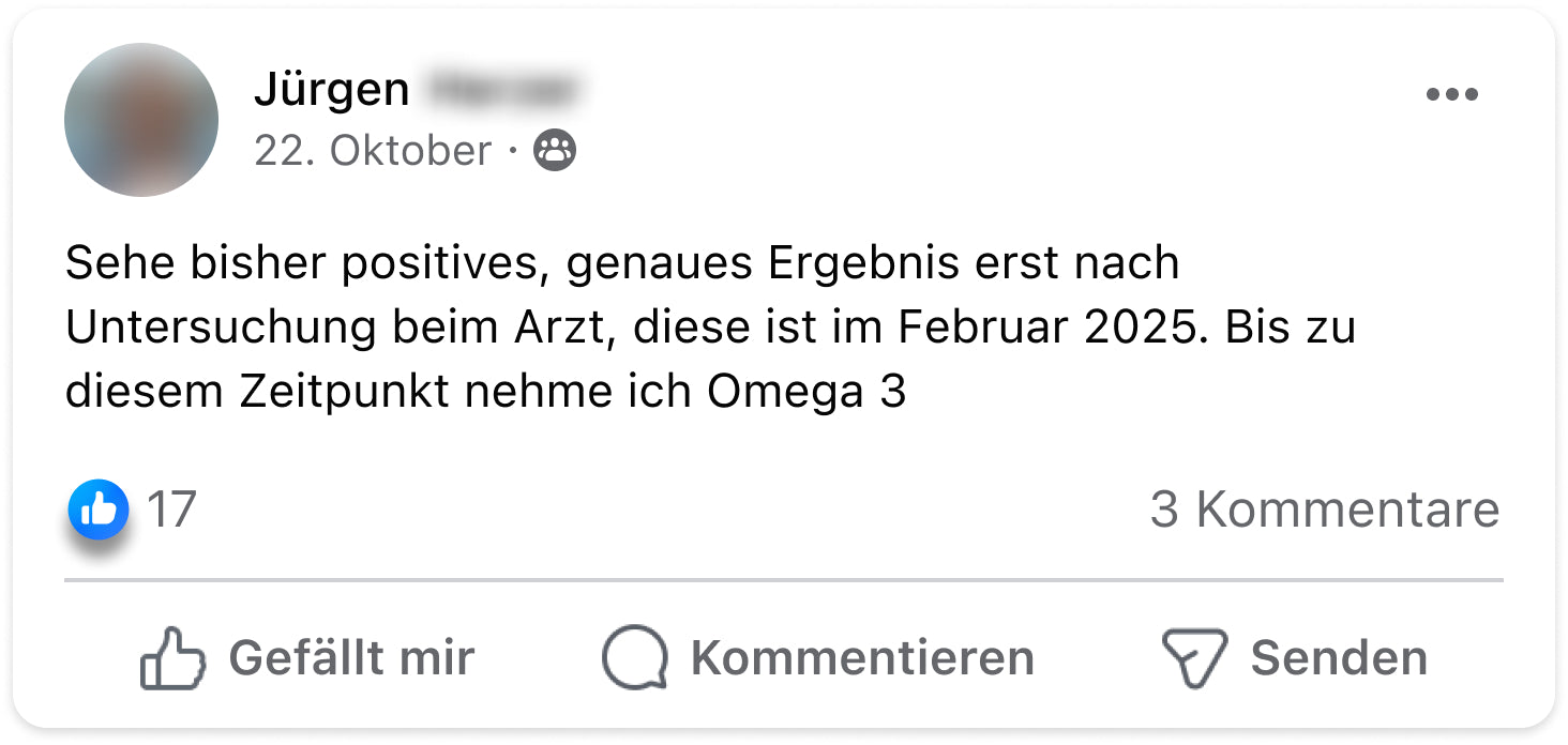 Ich stellte meine Ernährung um und begann, die Omega-3-Kapseln von Vita Moment zu nehmen – zunächst skeptisch, doch heute weiß ich, dass es die richtige Entscheidung war. Mir geht es deutlich besser, ich konnte bereits einige Medikamente absetzen und bin wieder schmerzfrei spazieren. Meine Entzündungen sind rückläufig, und auch meine Familie sieht, wie sehr ich mich verändert habe.