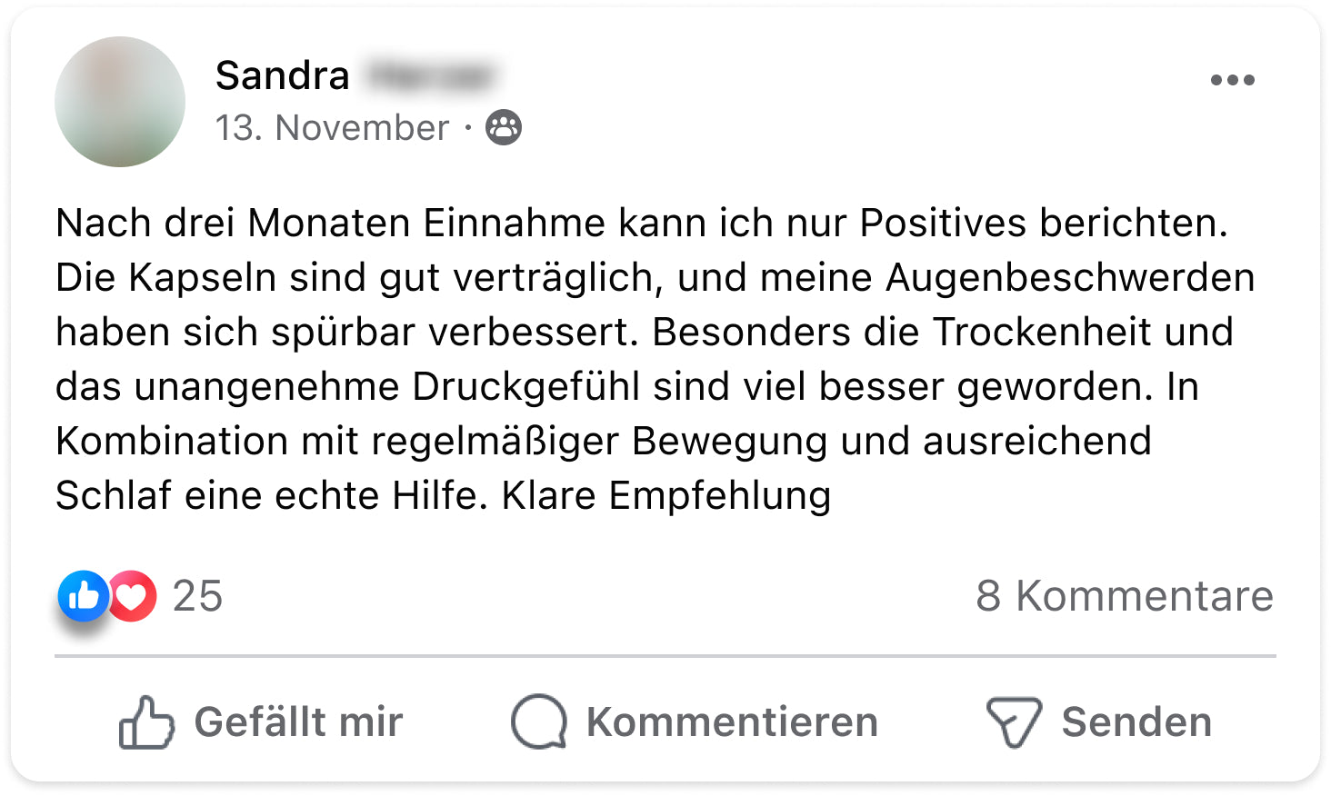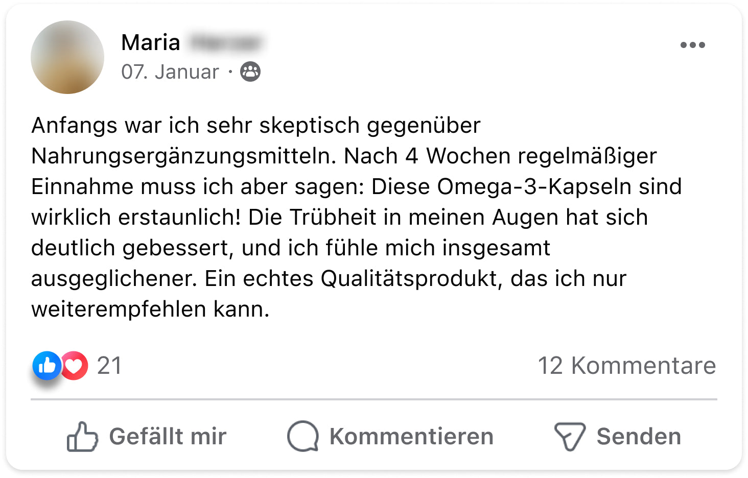 Nach Jahren der Behandlung meiner Makuladegeneration und der damit verbundenen belastenden Nebenwirkungen habe ich mich intensiv mit alternativen Möglichkeiten beschäftigt. Auf Empfehlung begann ich mit der Einnahme von den VitaMoment Omega-3-Kapseln, kombiniert mit einer Ernährungsumstellung und Lebensstiländerungen. Nach sechs Monaten konsequenter Anwendung zeigte sich bei der Kontrolle beim Augenarzt eine deutliche Stabilisierung meiner Makula. Sehr empfehlenswert für Menschen mit Makuladegeneration, die nach einer natürlichen Unterstützung suchen.
