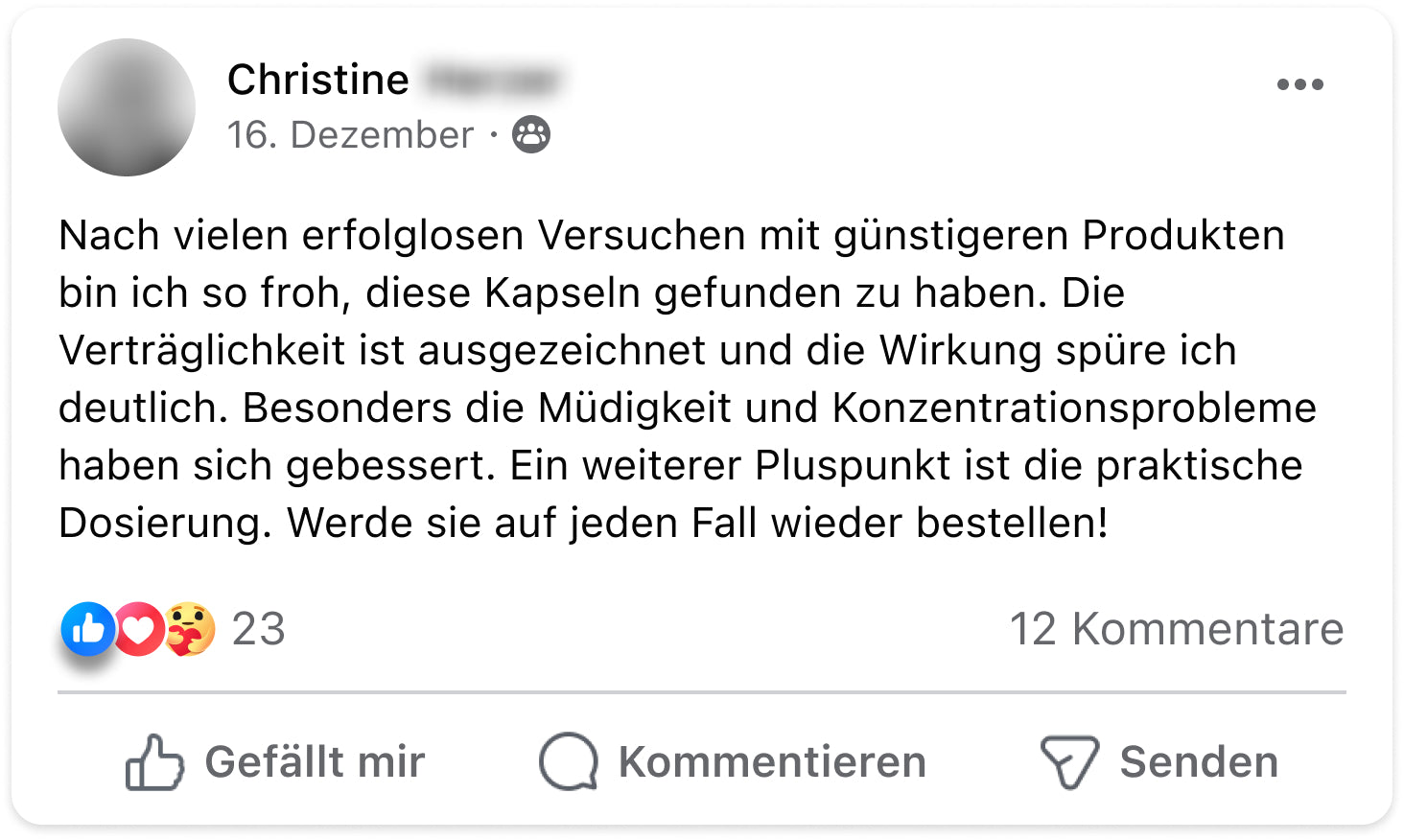 Disclaimer: Dieses Produkt ist nicht zur Diagnose, Behandlung, Heilung von oder zur Vorbeuge vor Krankheiten bestimmt. Die Ergebnisse können variieren / sind eventuell nicht typisch. Bewertungen oder Testimonials sind individuelle Erfahrungsberichte unserer Kunden. Diese Informationen stellen keine medizinische Beratung dar und dürfen auch nicht als eine solche verstanden werden. Sprich bitte mit deinem Arzt, bevor du dein regelmäßiges, ärztlich vorgeschriebenes Behandlungsverfahren änderst. Nahrungsergänzungsmittel sind kein Ersatz für eine ausgewogene und abwechslungsreiche Ernährung und eine gesunde Lebensweise. Das Bildmaterial unserer Kundenfeedbacks wurde aus Gründen des Persönlichkeitsrechts z.T. lizensiert erworben und entspricht nicht immer dem echten Erscheinungsbild.