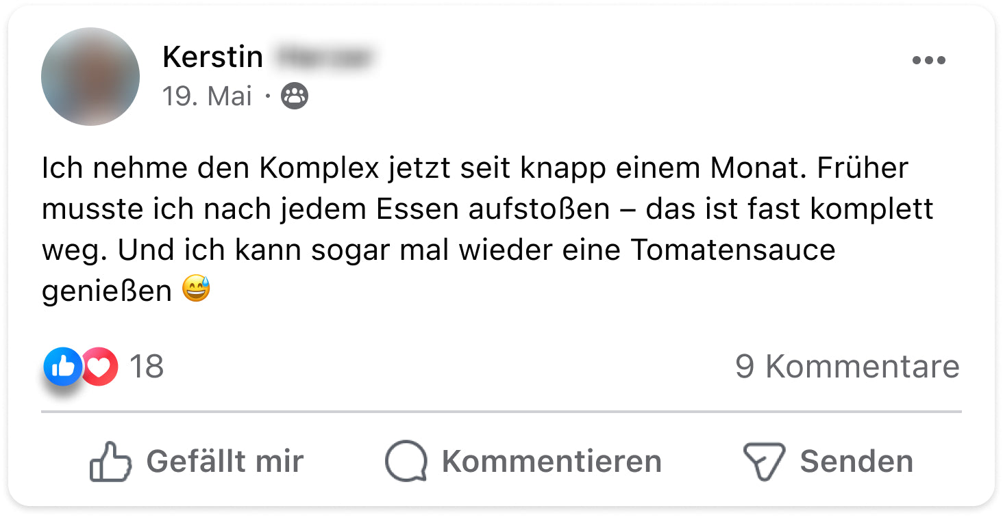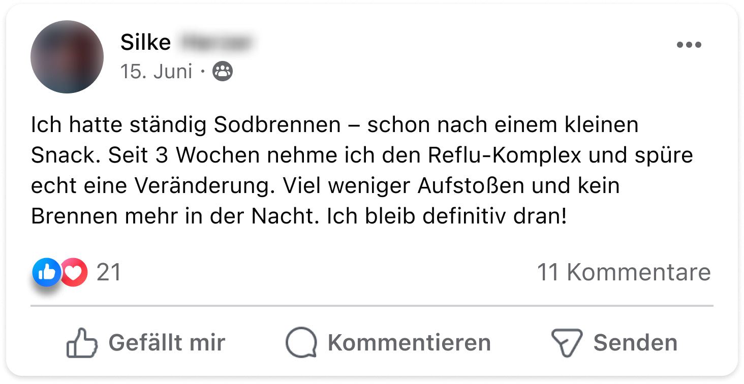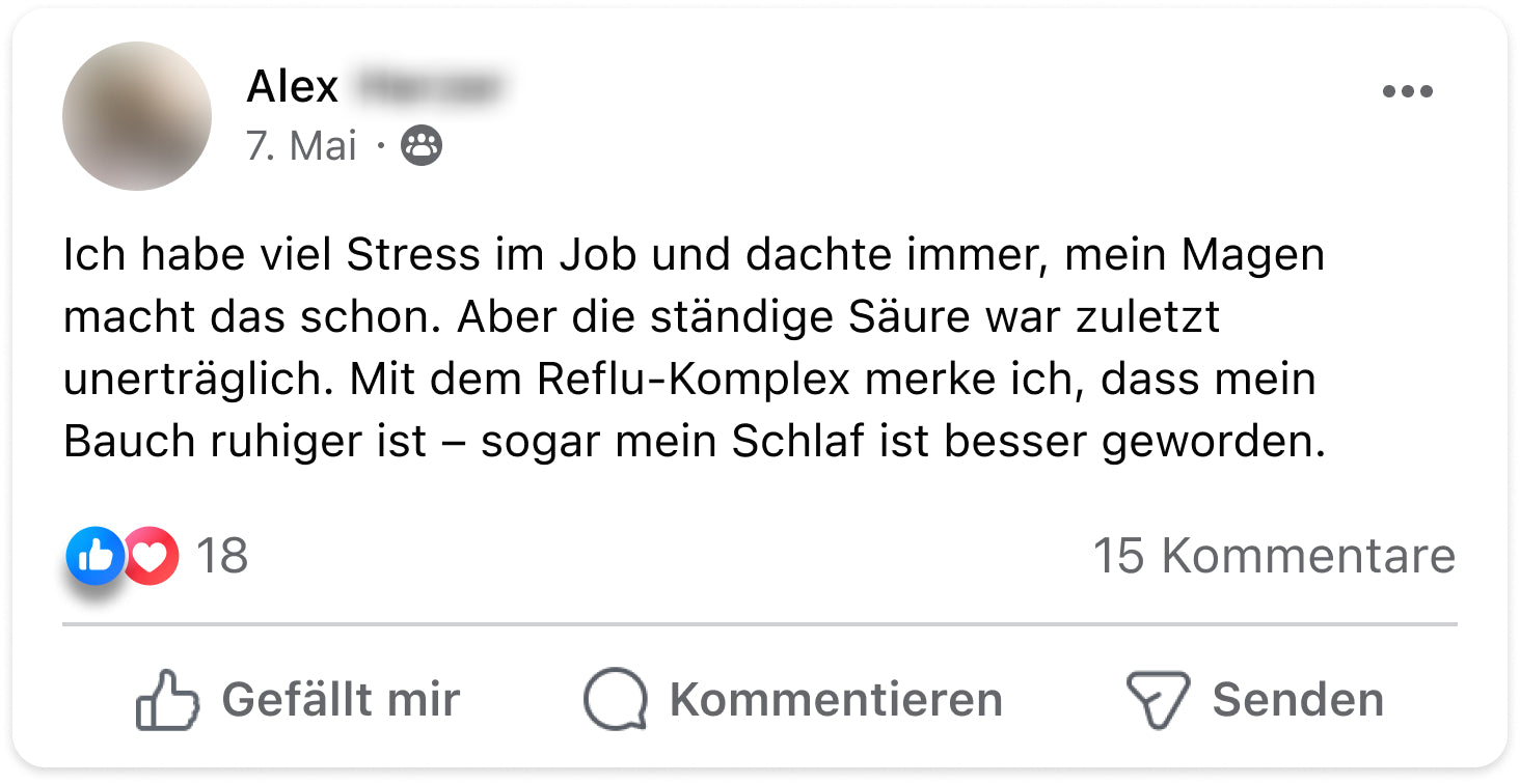 Ich hatte jahrelang mit Reflux und Sodbrennen zu kämpfen – vor allem abends und nachts. Es war so schlimm, dass ich im Sitzen schlafen musste. Seit ich den Reflu-Komplex nehme, hat sich mein Leben verändert. Die Nächte sind ruhig, mein Bauch fühlt sich entspannter an und ich kann wieder durchschlafen. Für mich ein echter Gamechanger.“
