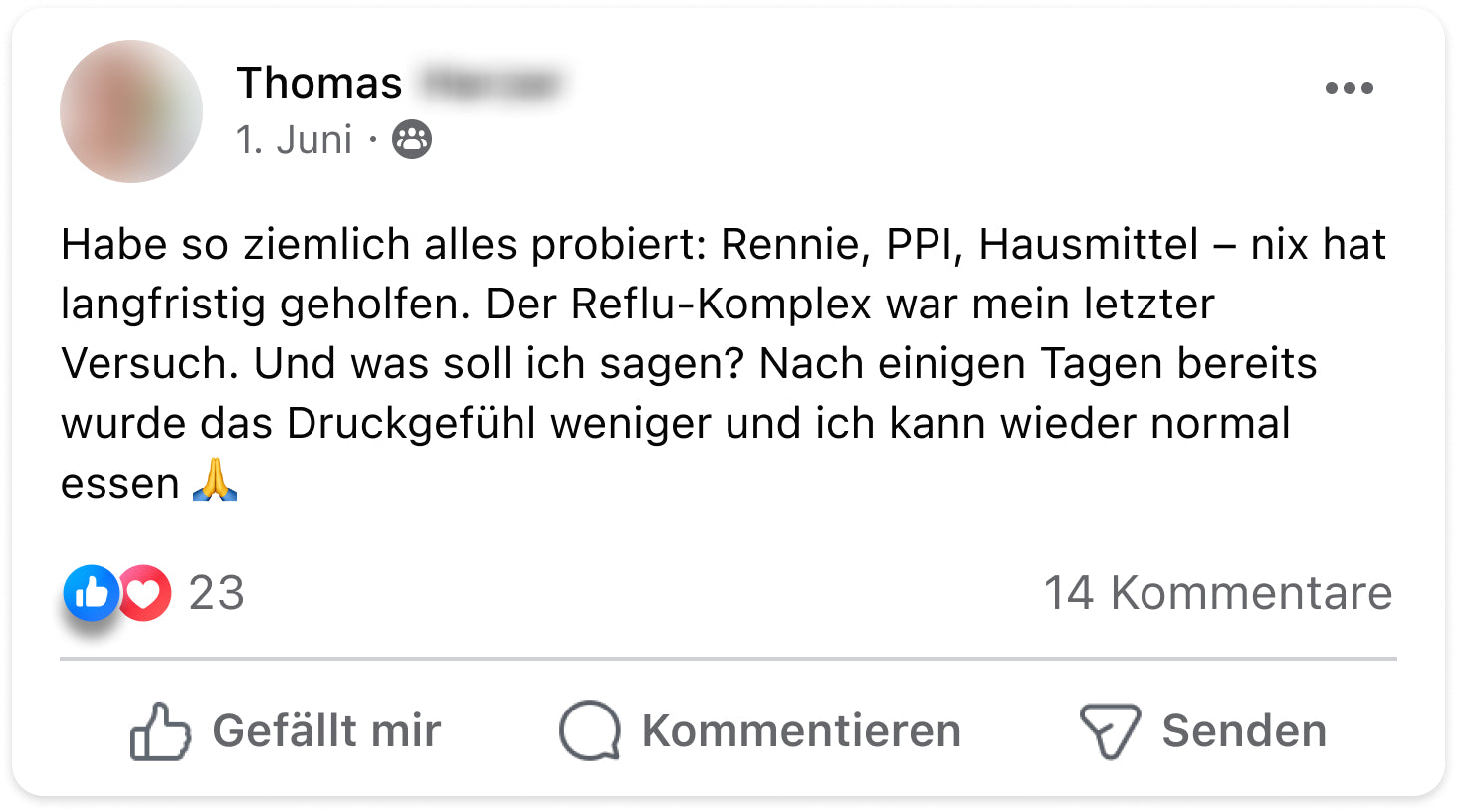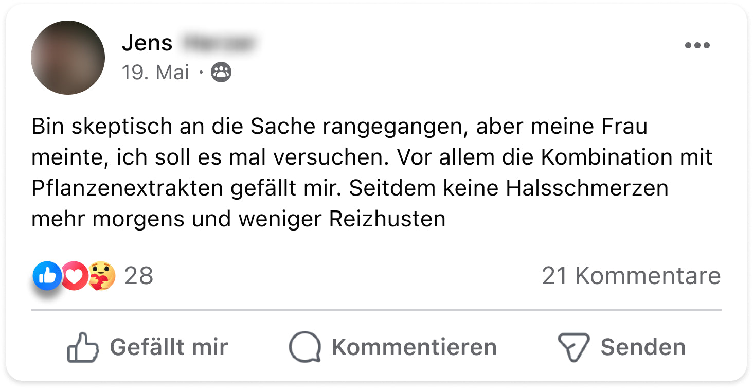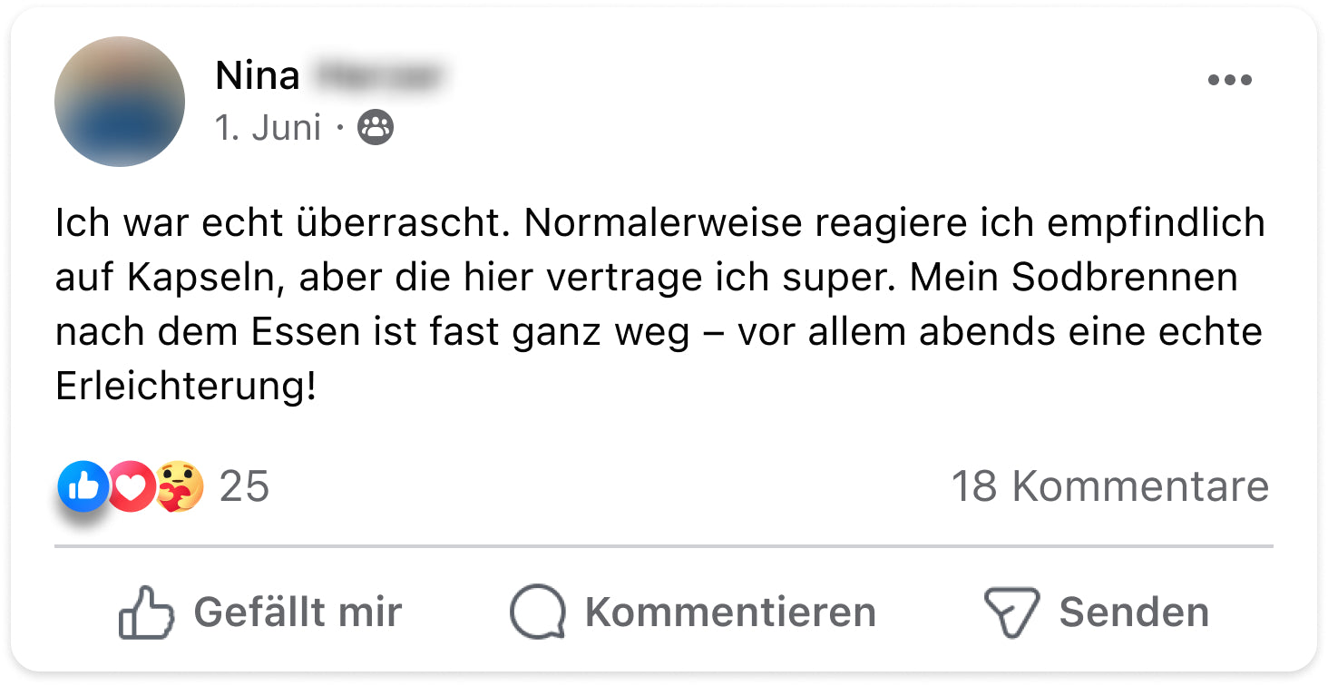 Ich hatte jahrelang mit Reflux und Sodbrennen zu kämpfen – vor allem abends und nachts. Es war so schlimm, dass ich im Sitzen schlafen musste. Seit ich den Reflu-Komplex nehme, hat sich mein Leben verändert. Die Nächte sind ruhig, mein Bauch fühlt sich entspannter an und ich kann wieder durchschlafen. Für mich ein echter Gamechanger.“