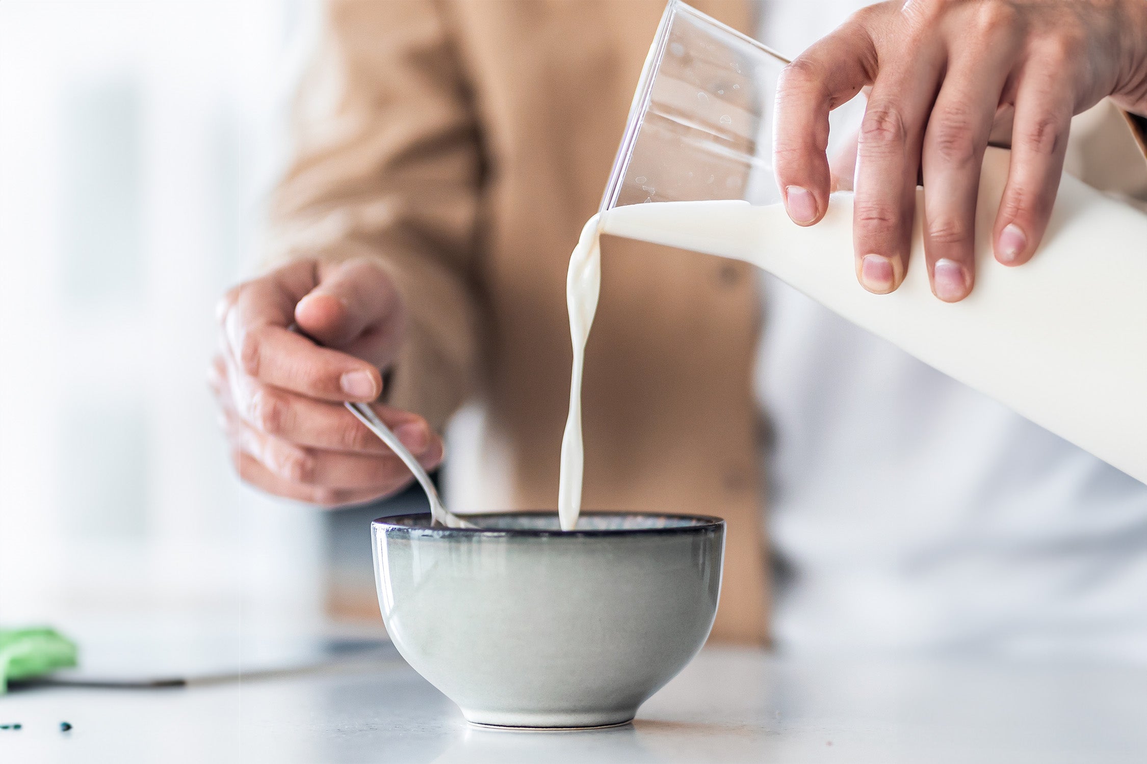 Vermische 60 g vom Porridge-Pulver mit 150 ml heißem Wasser oder einer Milch deiner Wahl.