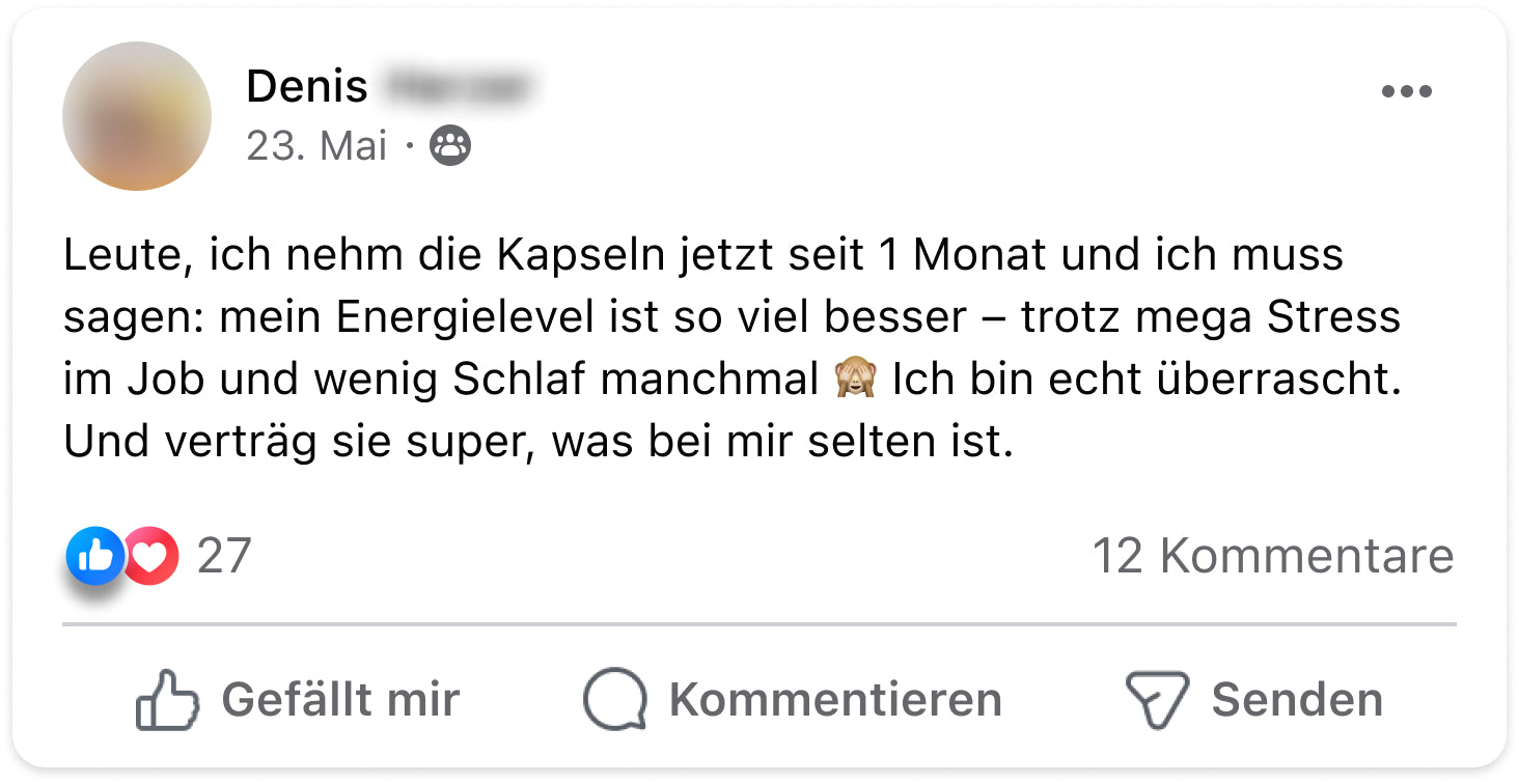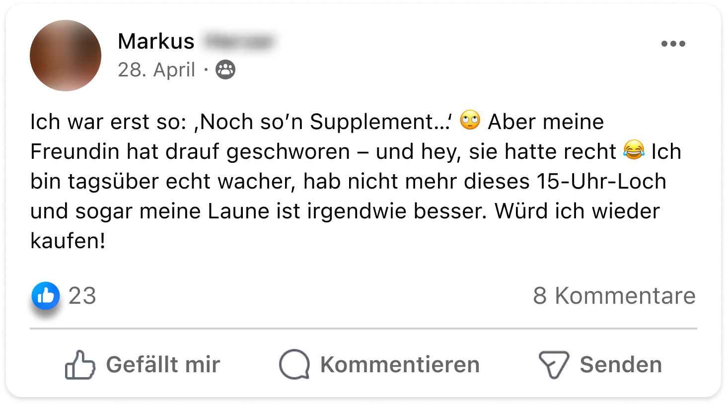 Disclaimer: Dieses Produkt ist nicht zur Diagnose, Behandlung, Heilung von oder zur Vorbeuge vor Krankheiten bestimmt. Die Ergebnisse können variieren / sind eventuell nicht typisch. Bewertungen oder Testimonials sind individuelle Erfahrungsberichte unserer Kunden. Diese Informationen stellen keine medizinische Beratung dar und dürfen auch nicht als eine solche verstanden werden. Sprich bitte mit deinem Arzt, bevor du dein regelmäßiges, ärztlich vorgeschriebenes Behandlungsverfahren änderst. Nahrungsergänzungsmittel sind kein Ersatz für eine ausgewogene und abwechslungsreiche Ernährung und eine gesunde Lebensweise. Das Bildmaterial unserer Kundenfeedbacks wurde aus Gründen des Persönlichkeitsrechts z.T. lizensiert erworben und entspricht nicht immer dem echten Erscheinungsbild.