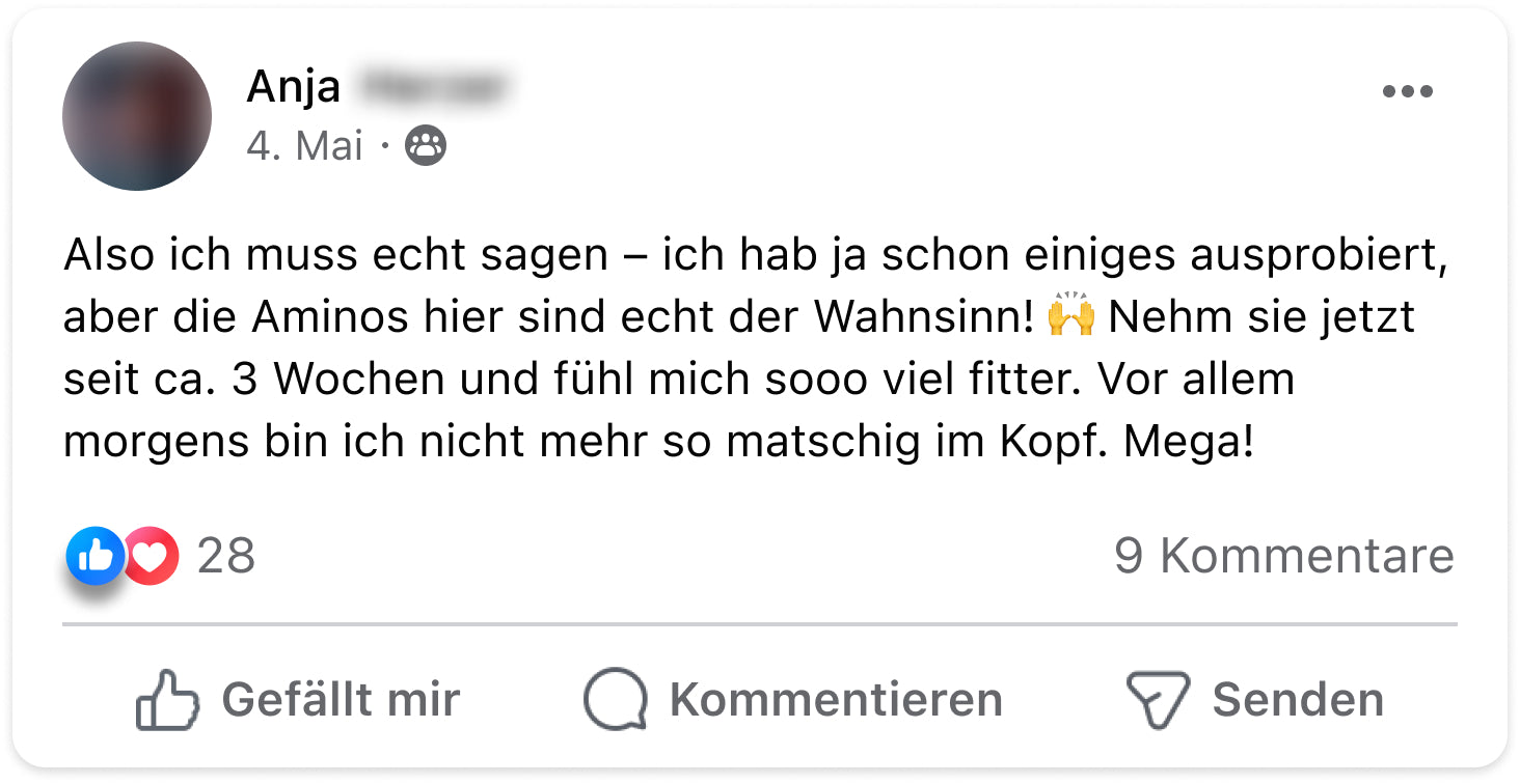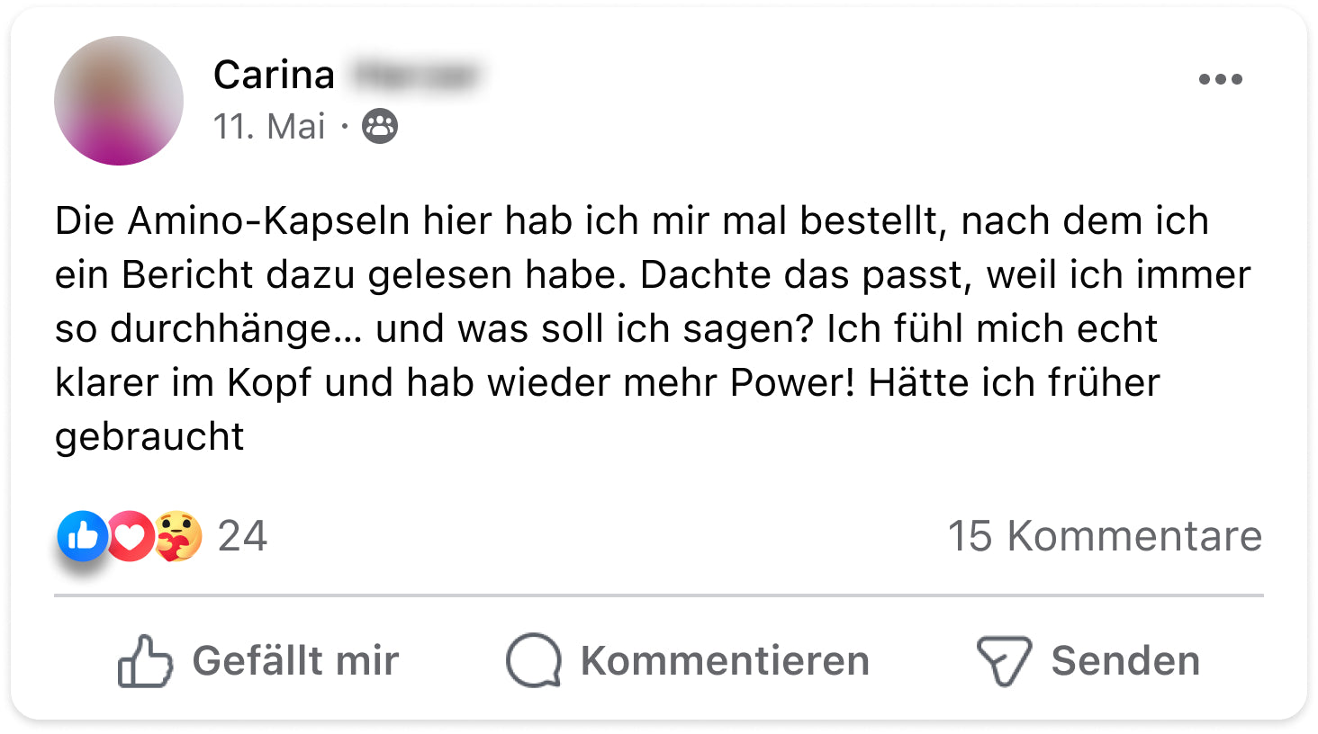 Endlich wieder Energie – ganz ohne Mittagstief! Ich war oft müde, obwohl ich eigentlich genug schlafe. Seit ich den Amino-Komplex nehme, fühle ich mich deutlich wacher und belastbarer – auch an stressigen Tagen. Besonders positiv: Ich brauche keinen Kaffee mehr, um durch den Nachmittag zu kommen!