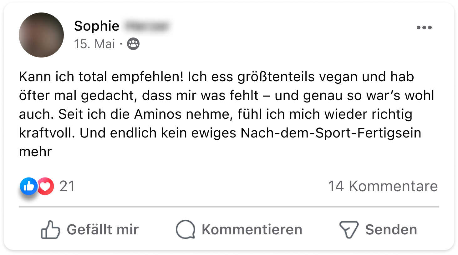 Perfekt für meinen veganen Alltag – fühle mich wieder klar im Kopf! Als Veganerin achte ich sehr auf meine Nährstoffversorgung – aber Aminosäuren hatte ich nie wirklich auf dem Schirm. Seit ich den Amino-Komplex von VitaMoment nehme, merke ich einen richtigen Unterschied: Mein Kopf ist klarer, ich bin konzentrierter und nicht mehr so schnell erschöpft. Und das Beste: komplett ohne Zusätze!