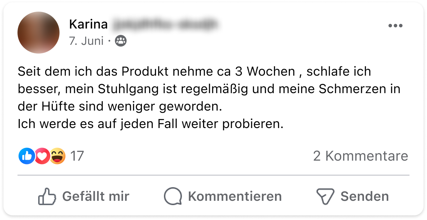 Disclaimer: Dieses Produkt ist nicht zur Diagnose, Behandlung, Heilung von oder zur Vorbeuge vor Krankheiten bestimmt. Die Ergebnisse können variieren / sind eventuell nicht typisch. Bewertungen oder Testimonials sind individuelle Erfahrungsberichte unserer Kunden. Diese Informationen stellen keine medizinische Beratung dar und dürfen auch nicht als eine solche verstanden werden. Sprich bitte mit deinem Arzt, bevor du dein regelmäßiges, ärztlich vorgeschriebenes Behandlungsverfahren änderst. Nahrungsergänzungsmittel sind kein Ersatz für eine ausgewogene und abwechslungsreiche Ernährung und eine gesunde Lebensweise. Das Bildmaterial unserer Kundenfeedbacks wurde aus Gründen des Persönlichkeitsrechts z.T. lizensiert erworben und entspricht nicht immer dem echten Erscheinungsbild.