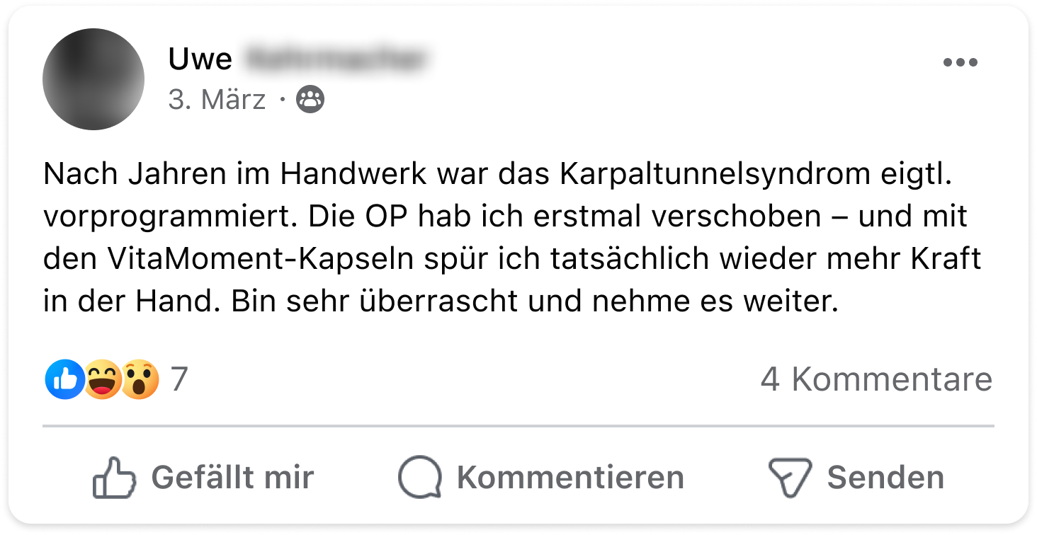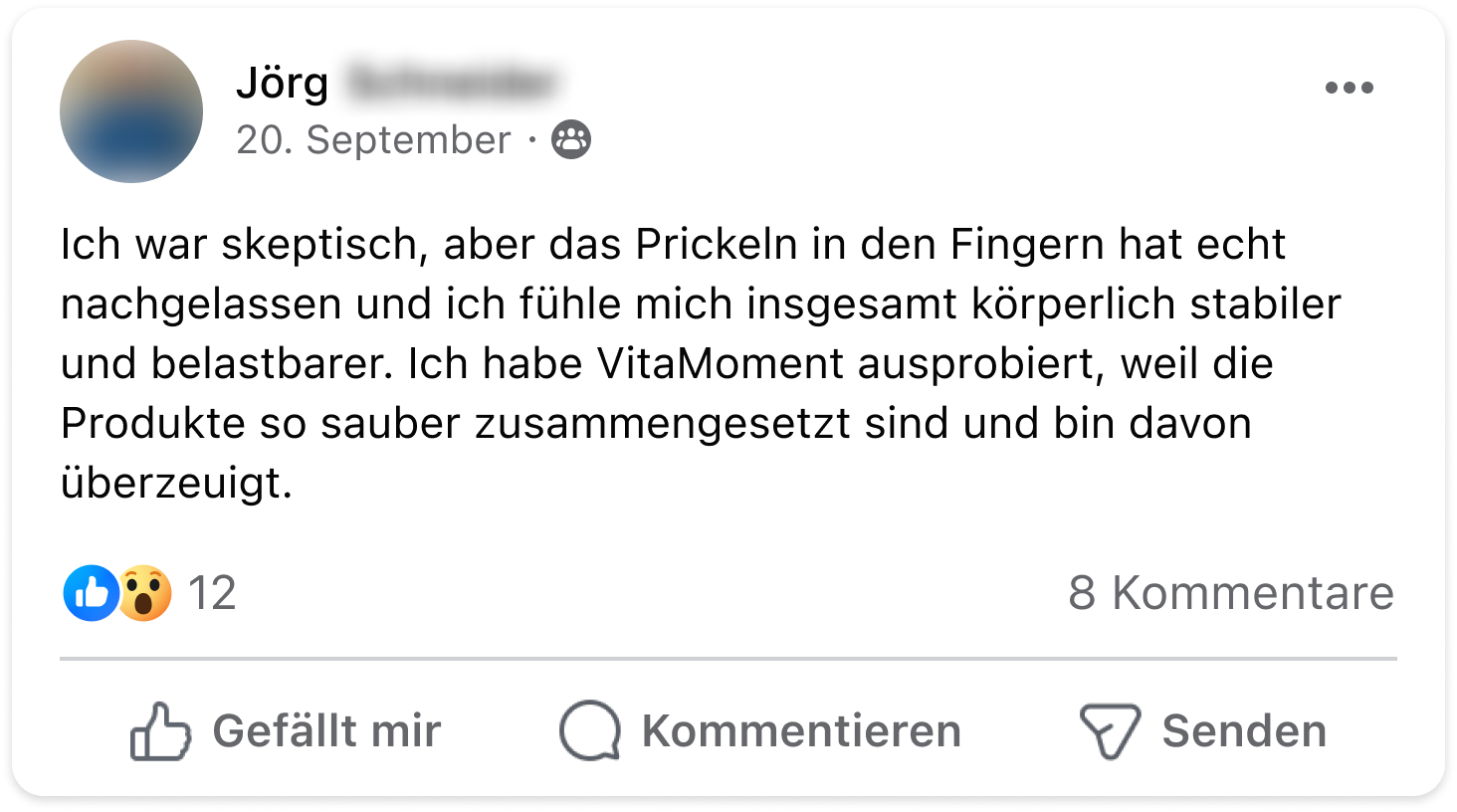 Meine Frau und ich nutzen die Produkte von VitaMoment schon seit längerer Zeit und haben sie fest in unseren Alltag integriert. In Kombination mit eiweißbetonter Ernährung helfen sie uns, den Nährstoffhaushalt im Gleichgewicht zu halten. Das Ergebnis: mehr Energie, besseres Wohlbefinden und ein echter Zugewinn an Lebensqualität. Für uns jeden Tag aufs Neue wertvoll.