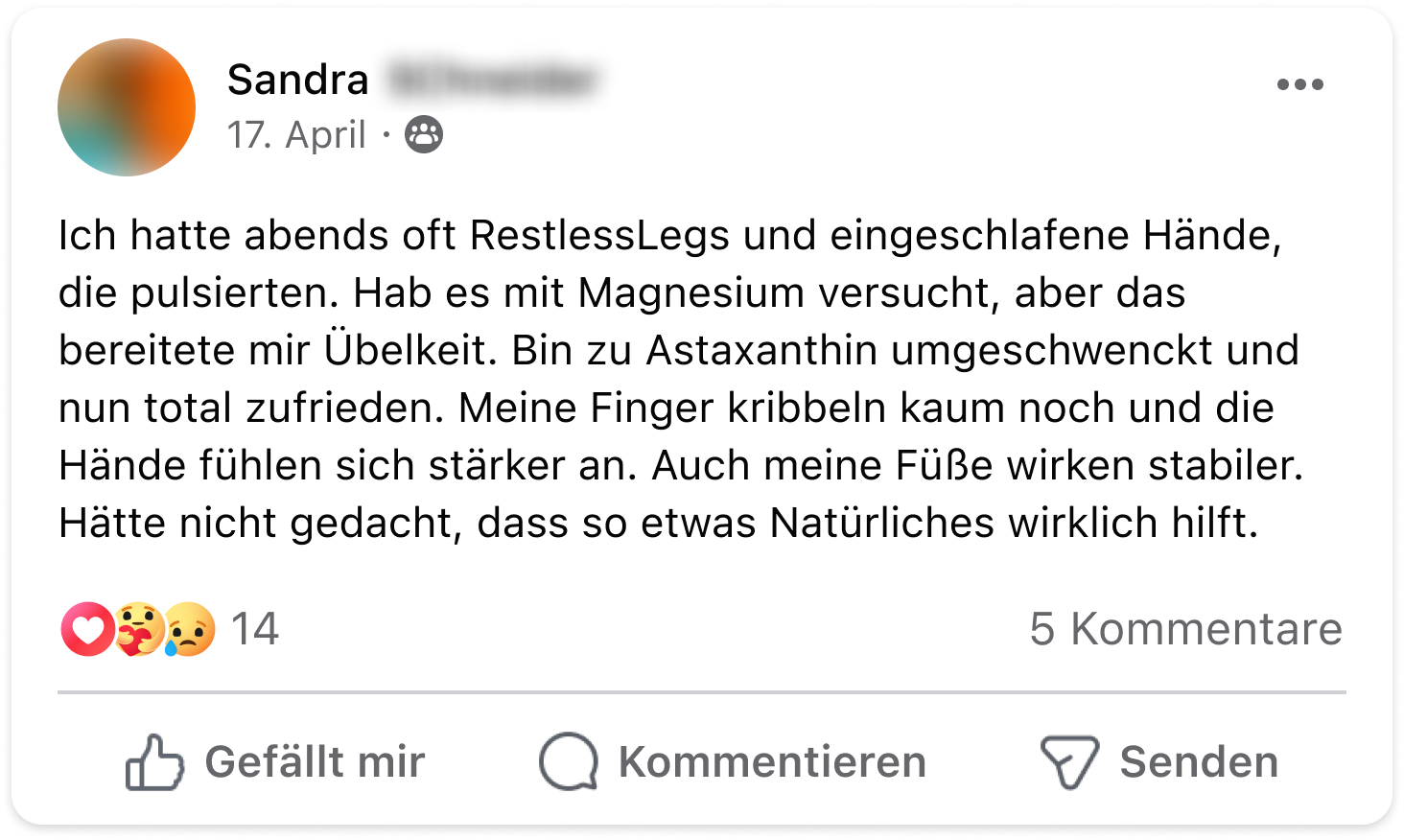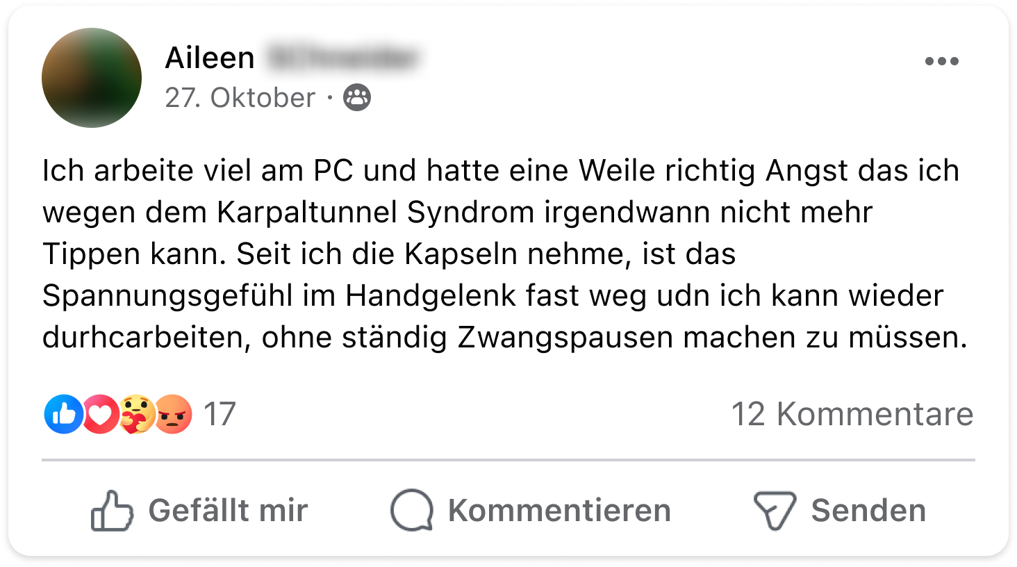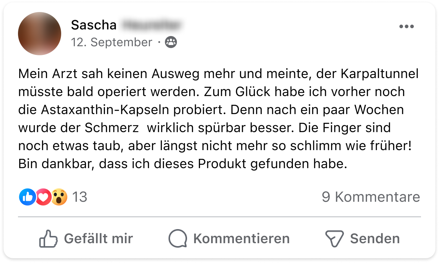 Ich bin Lehrerin und hatte zuletzt immense Probleme, überhaupt irgendetwas zu schreiben. Am Whiteboard oder in Heften, es schmerzte trotz Schiene und Schonhaltung oft bis hinauf in die Schulter. Kortisonspritzen hatte ich schon 3, doch die wirkten immer nur kurz. Mit Astaxanthin ging ich das Problem anders an und siehe da: Derzeit spricht meine Ärztin nicht mehr von einer OP, denn es wird tatsächlich erträglicher!
