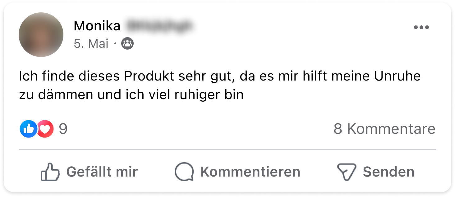Disclaimer: Dieses Produkt ist nicht zur Diagnose, Behandlung, Heilung von oder zur Vorbeuge vor Krankheiten bestimmt. Die Ergebnisse können variieren / sind eventuell nicht typisch. Bewertungen oder Testimonials sind individuelle Erfahrungsberichte unserer Kunden. Diese Informationen stellen keine medizinische Beratung dar und dürfen auch nicht als eine solche verstanden werden. Sprich bitte mit deinem Arzt, bevor du dein regelmäßiges, ärztlich vorgeschriebenes Behandlungsverfahren änderst. Nahrungsergänzungsmittel sind kein Ersatz für eine ausgewogene und abwechslungsreiche Ernährung und eine gesunde Lebensweise. Das Bildmaterial unserer Kundenfeedbacks wurde aus Gründen des Persönlichkeitsrechts z.T. lizensiert erworben und entspricht nicht immer dem echten Erscheinungsbild.