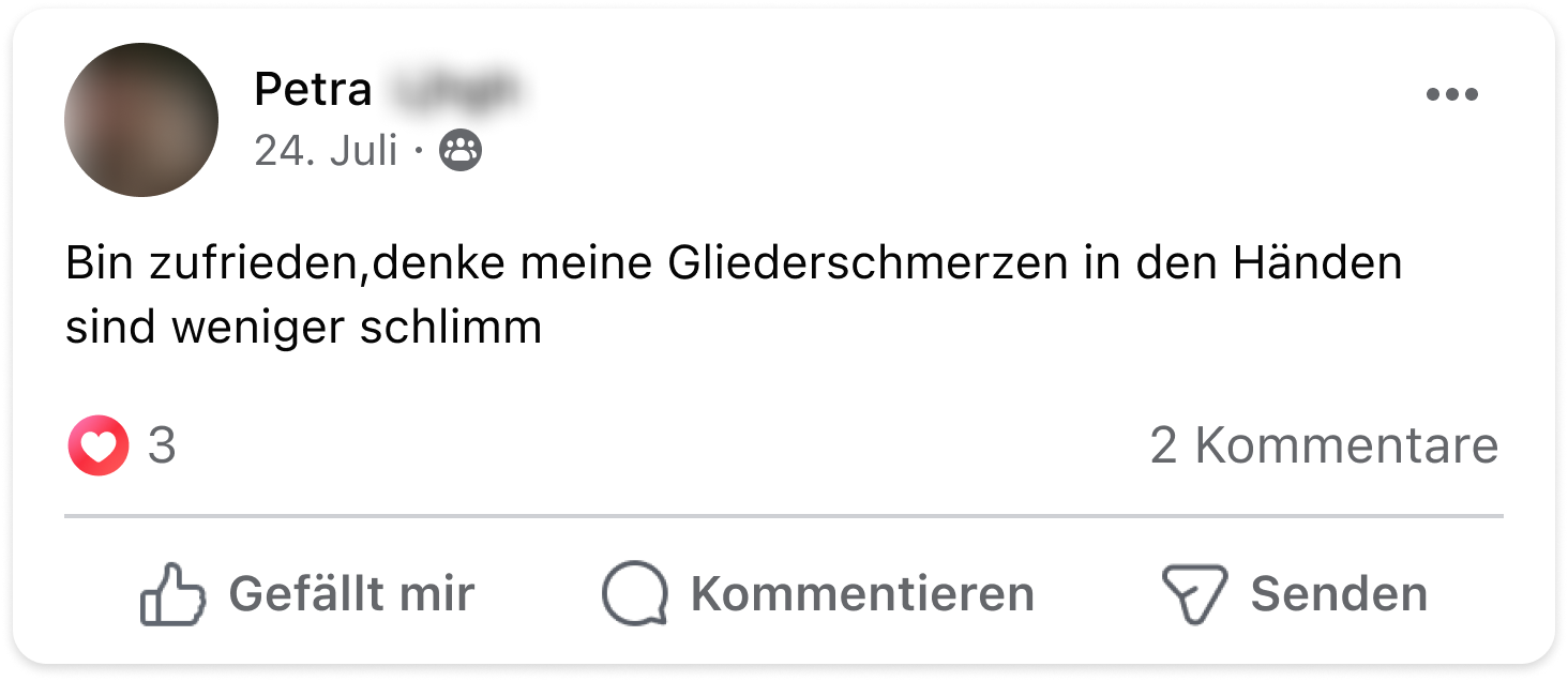 Meine Handgelenke schmerzten immer beim Gartenumgraben und Fahrradfahren. Natürlich ist das auch die mechanische Reizung. Doch ich will auf nichts verzichten! Und Spritzen in die Hand kommen für mich nicht in Frage. Zum Glück empfahl mir meine Apothekerin, Antioxidanzien auszuprobieren. Mit Astaxanthin sind die Handschmerzen merklich weniger und es geht mir insgesamt deutlich besser.