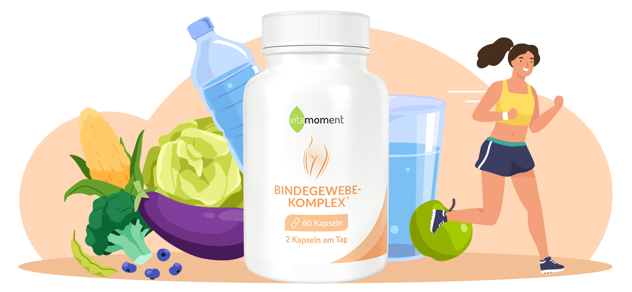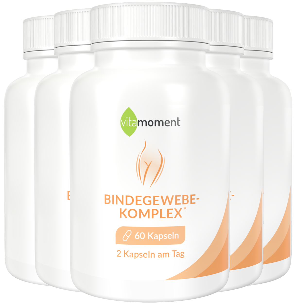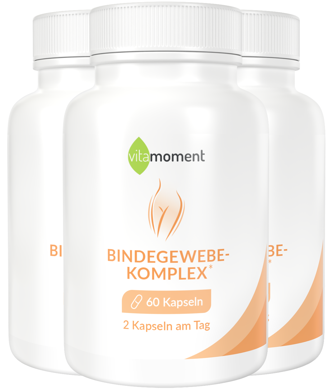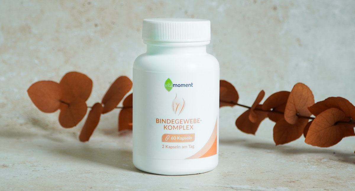 Der Bindegewebe-Komplex von VitaMoment steht dir genau hierbei zur Seite, sodass du alltagstauglich und unkompliziert deine Hautelastizität und Bindegewebsstruktur unterstützen kannst.