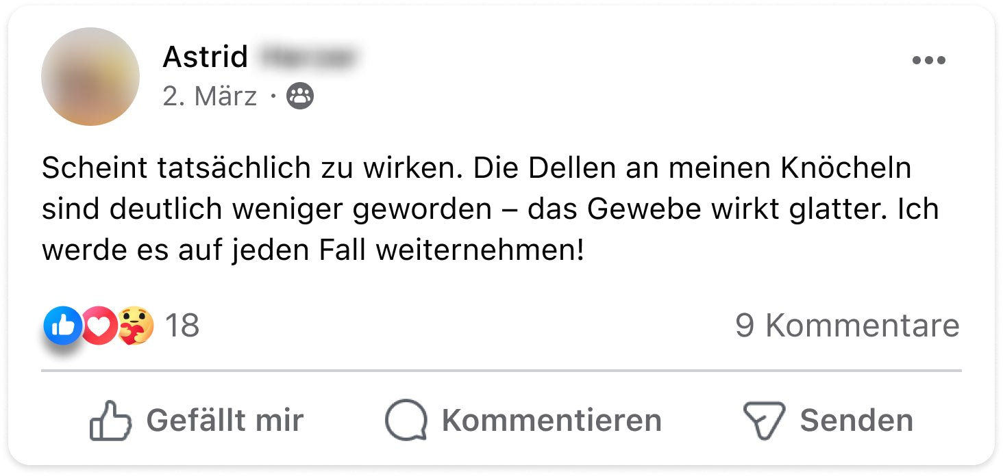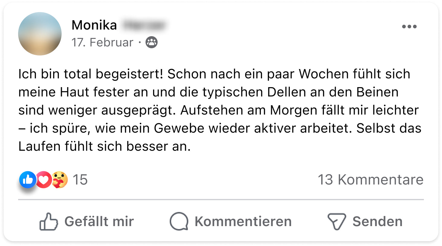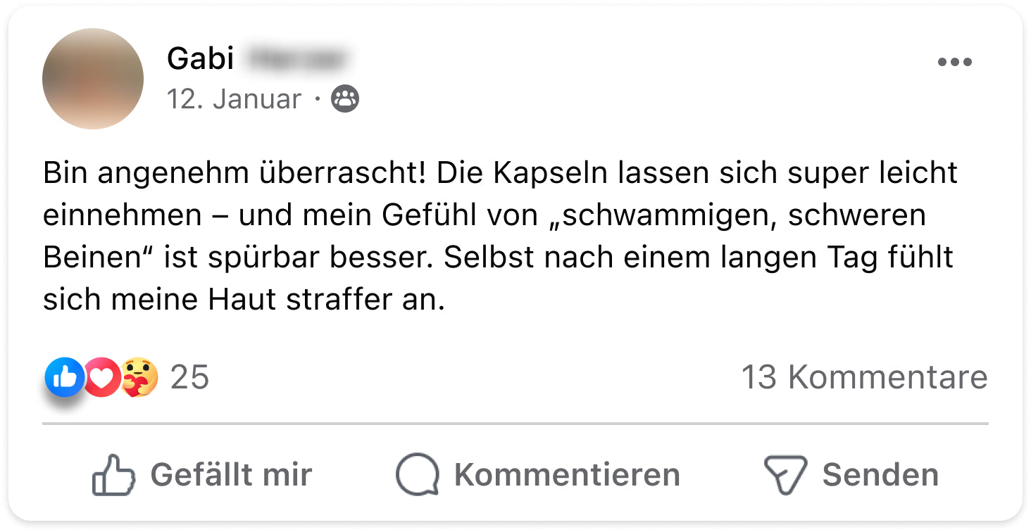 Plötzlich bekam ich in der kalten Jahreszeit geschwollene Beine – etwas, das ich sonst nur aus heißen Sommern kannte. Das war sehr unangenehm, vor allem beim Bergabgehen oder Treppensteigen. Durch Zufall bin ich auf den Bindegewebe-Komplex gestoßen. Die Inhaltsstoffe wie Brennnessel sind mir als entwässernd bekannt, also habe ich es ausprobiert. Schon nach kurzer Zeit sind die Wassereinlagerungen spürbar zurückgegangen – ganz ohne Nebenwirkungen. Ich weiß, dass ich eine gewisse Bindegewebsschwäche habe, und für mich ist dieses Produkt eine echte Hilfe.