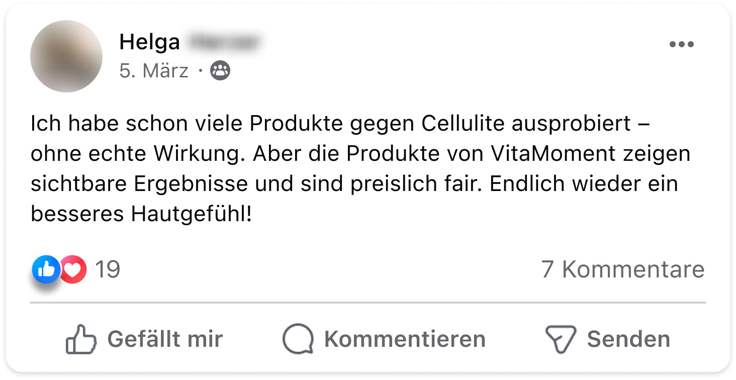 Ich nutze die Produkte von VitaMoment schon seit Längerem und bin jedes Mal begeistert. Als Ergebnis spüre ich mehr Energie, Ausgeglichenheit und einfach ein besseres Körpergefühl. Für mich sind die Produkte ein fester Bestandteil meines Alltags geworden – und ich kann sie von Herzen weiterempfehlen.