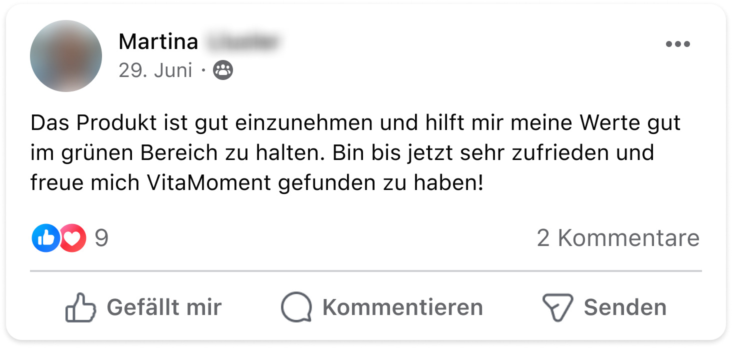 Seit meiner ersten Bestellung Anfang 2023 gehören die Produkte von VitaMoment fest zu meinem Alltag. In Kombination mit bewusster Ernährung und Bewegung unterstützen sie mich dabei, mich fitter, ausgeglichener und gesünder zu fühlen. Besonders schätze ich nicht nur die Qualität, sondern auch den persönlichen Support. Ich bin dankbar, VitaMoment entdeckt zu haben – und bleibe überzeugt dabei!