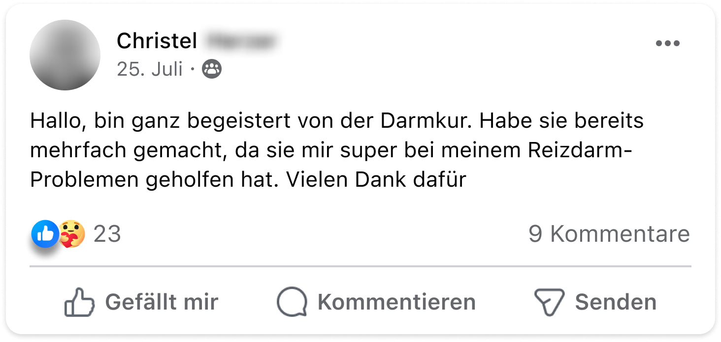 Meine Tochter hat mich zu der Darmkur gebracht. Sie meinte "Mama, du siehst hochschwanger aus", weil mein Bauch nach dem Essen immer so anschwoll. Ich konnte nicht mehr schlafen, es hat nur im Bauch gegurgelt und mir war schlecht. Jetzt fühle ich mich wieder gut und bin wirklich glücklich. In Zukunft werde ich die Darmkur mindestens einmal im Jahr machen. 😊