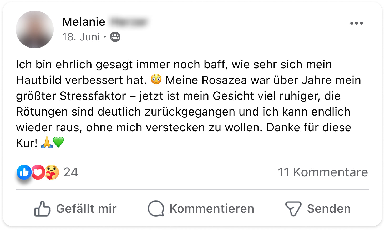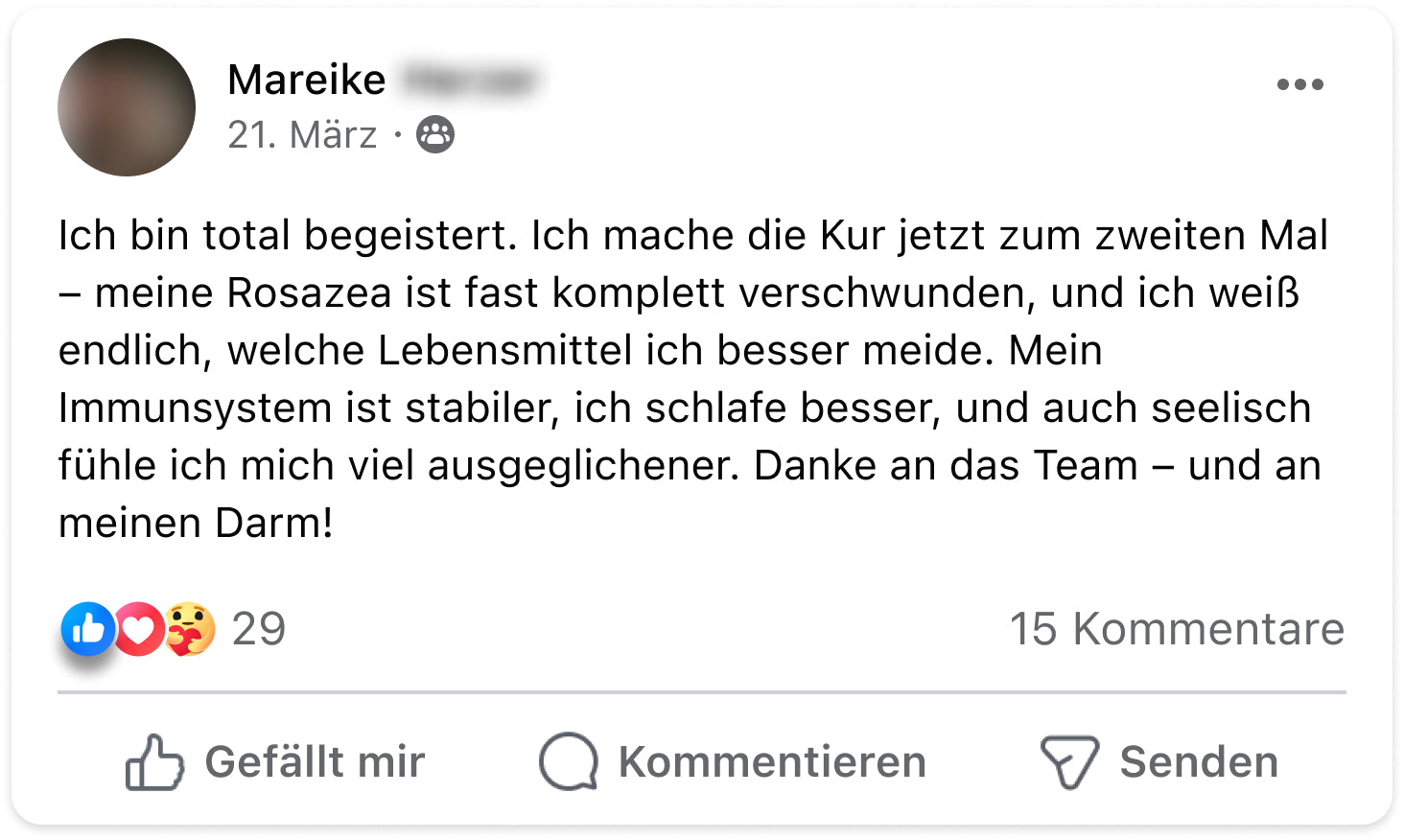 Seit Jahren habe ich mit Rosazea gekämpft. Mal war es besser, dann wieder schlimmer. Cremes, Verzicht, Antibiotika – nichts hat langfristig geholfen. Erst durch die VitaMoment Darmkur habe ich verstanden, dass mein Darm die eigentliche Schwachstelle war. Seit der Kur ist mein Hautbild viel ruhiger, ich fühle mich ausgeglichener – und traue mich endlich wieder ohne Make-up raus. Das hätte ich früher nie für möglich gehalten.