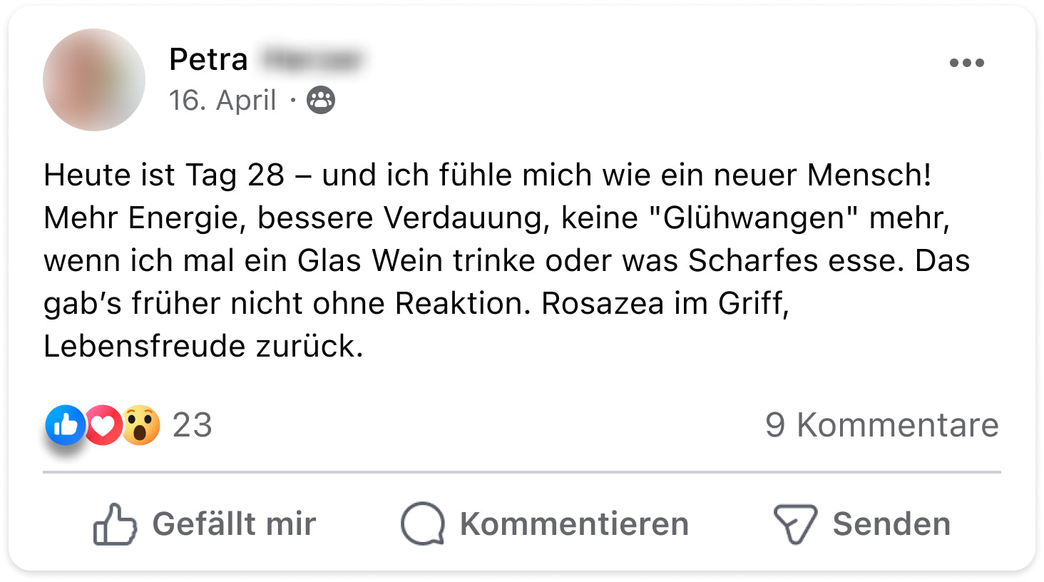 Meine Haut glüht nicht mehr – und ich auch nicht. Rosazea war für mich vor allem eines: eine ständige Unsicherheit. Mein Gesicht war oft gerötet, heiß, unruhig. Ich konnte nicht einmal ein Glas Wein trinken, ohne dass meine Haut förmlich explodierte. Eine Freundin empfahl mir die 3-Phasen-Darmkur – und was soll ich sagen: Schon nach wenigen Wochen fühlte ich mich innerlich ruhiger, mein Bauch war nicht mehr aufgebläht und mein Hautbild wurde spürbar stabiler. Heute ist es kein Thema mehr. Ich hätte mir gewünscht, das früher zu wissen.