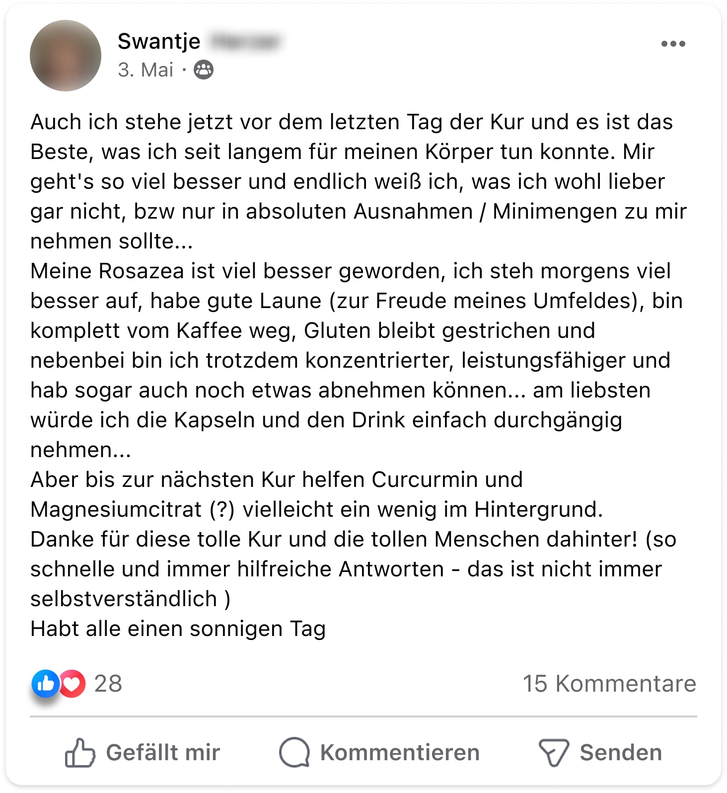 Schon in den ersten Tagen verschwand meine Übelkeit und die Bauchkrämpfe ließen nach. Die Kur beinhaltete viele Rezepte, was hilfreich war, da ich nicht wusste, auf was ich verzichten sollte. Diese Veränderung hat meine Lebensqualität verbessert. Ich habe die Kur schon Freunden empfohlen, die ähnliche Probleme haben!