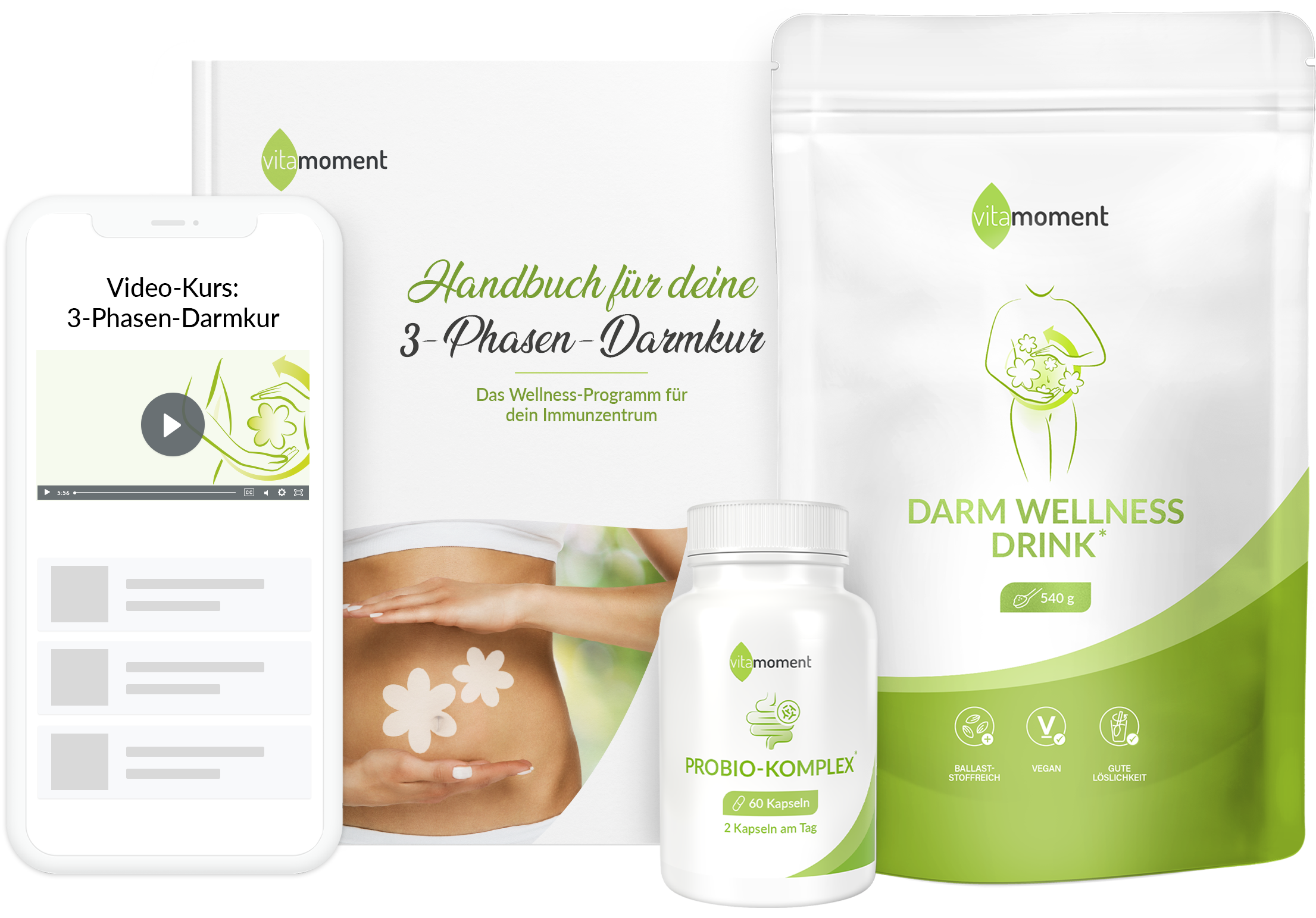 Mit den hochwertigen VitaMoment-Milchsäurebakterien im Probio-Komplex und dem speziell formulierten Darm-Wellness-Drink stärkst du dein Zentrum der Gesundheit von innen heraus. Selbst wenn du deine Ernährung ansonsten nicht groß veränderst.