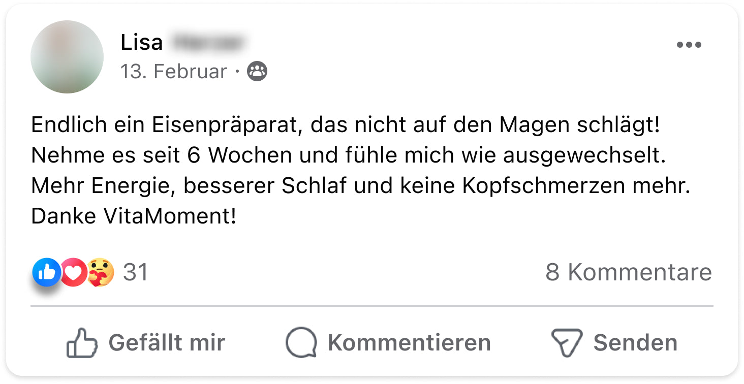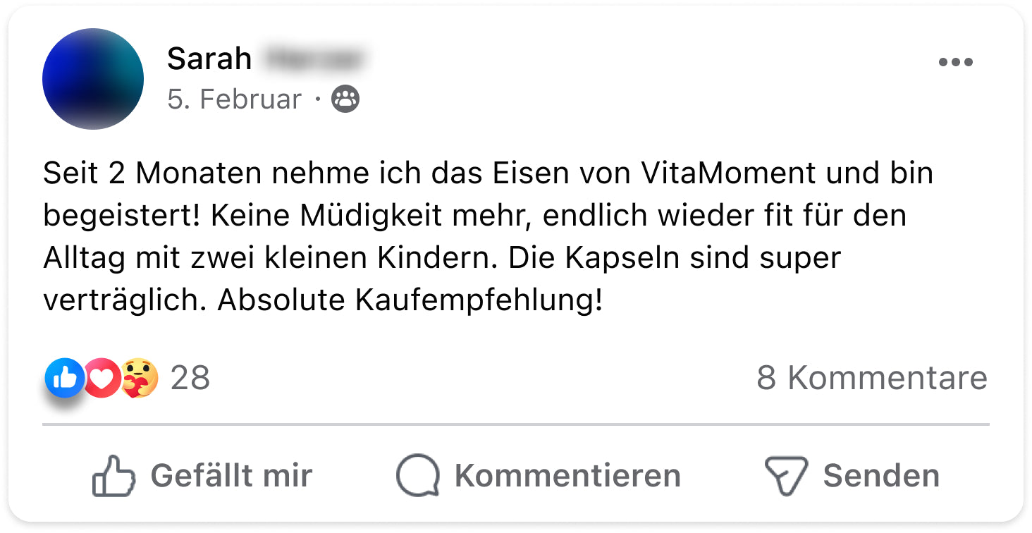 Durch VitaMoment habe ich endlich Nahrungsergänzung gefunden, die nicht nur wirkt, sondern auch super in meinen Alltag passt. Ob für mehr Energie, besseren Schlaf oder ein gutes Bauchgefühl – ich fühle mich rundum wohl. Besonders schätze ich den schnellen Support und die vielen durchdachten Produkte. Danke, dass es euch gibt!