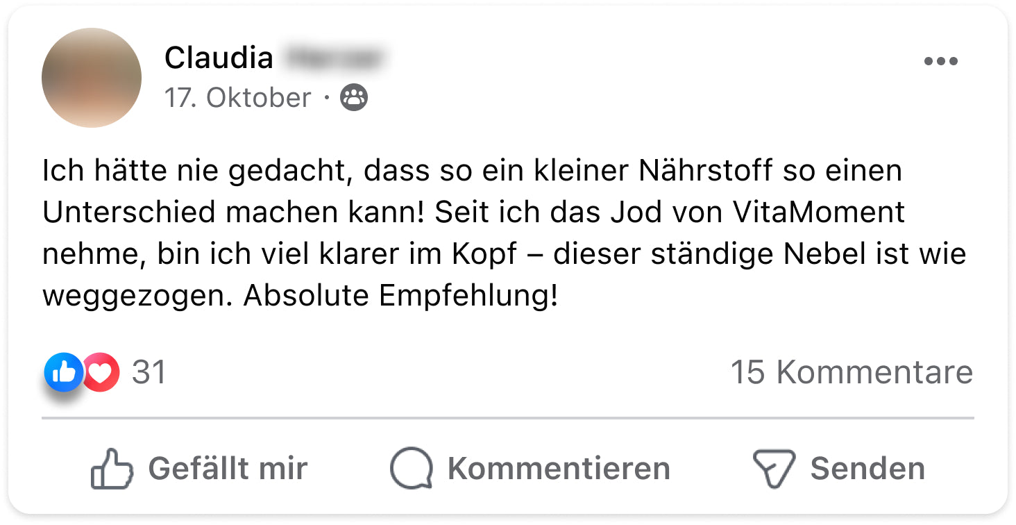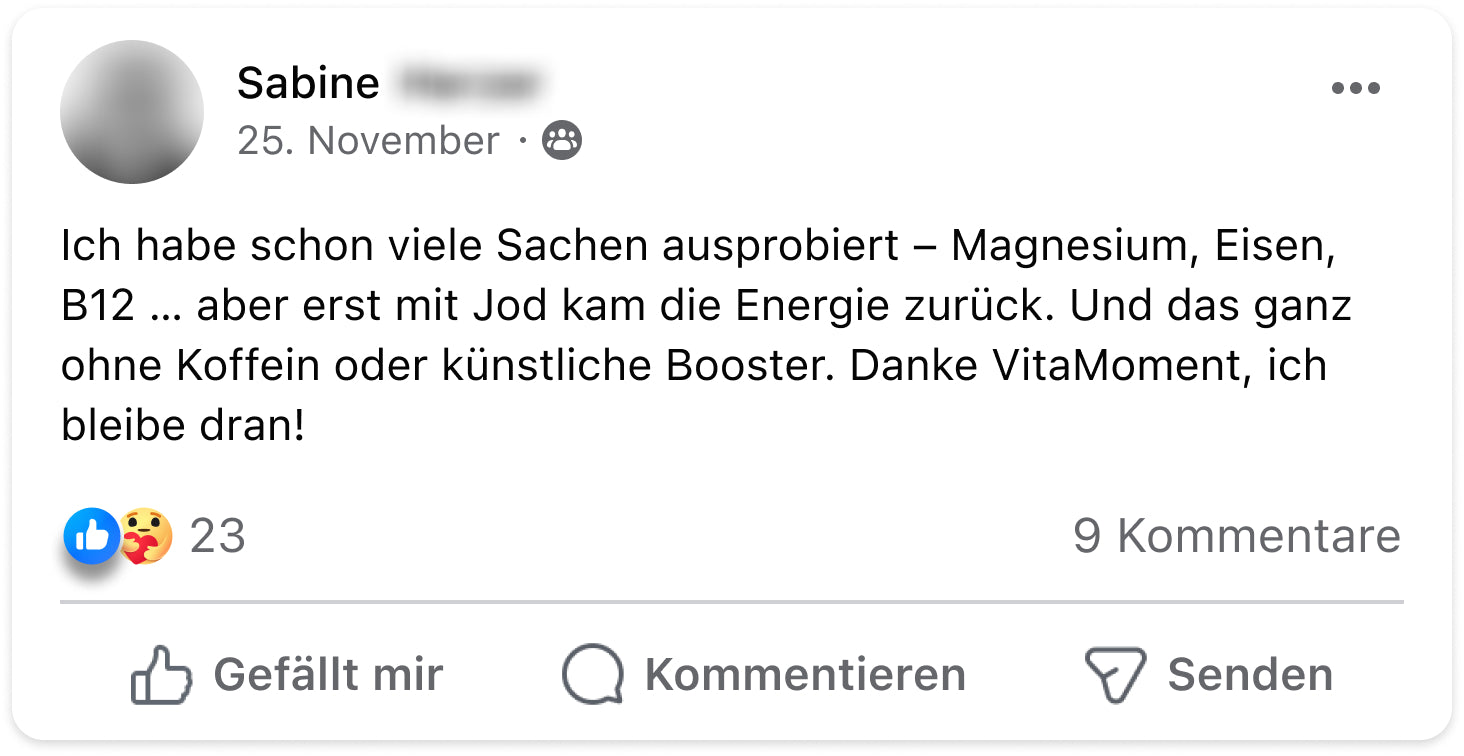 Ich war ständig müde, konnte mich kaum konzentrieren – und das, obwohl meine Schilddrüsenwerte im Blutbild in Ordnung waren. Seit ich das Jod von VitaMoment nehme, hat sich mein Energielevel komplett verändert. Ich wache morgens wieder erholt auf, bin klar im Kopf und habe endlich das Gefühl, mein Tag gehört wieder mir!