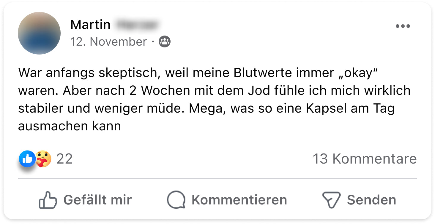 Ich hätte nie gedacht, dass Jod so eine Wirkung haben kann. Nach ein paar Wochen merkte ich, wie meine Muskeln weniger verspannt waren, ich wieder besser schlafen konnte – und vor allem geistig viel präsenter war. Es fühlt sich an, als wäre ein Schalter in mir umgelegt worden. Dieses Produkt hat in meinem Alltag wirklich einen Unterschied gemacht.