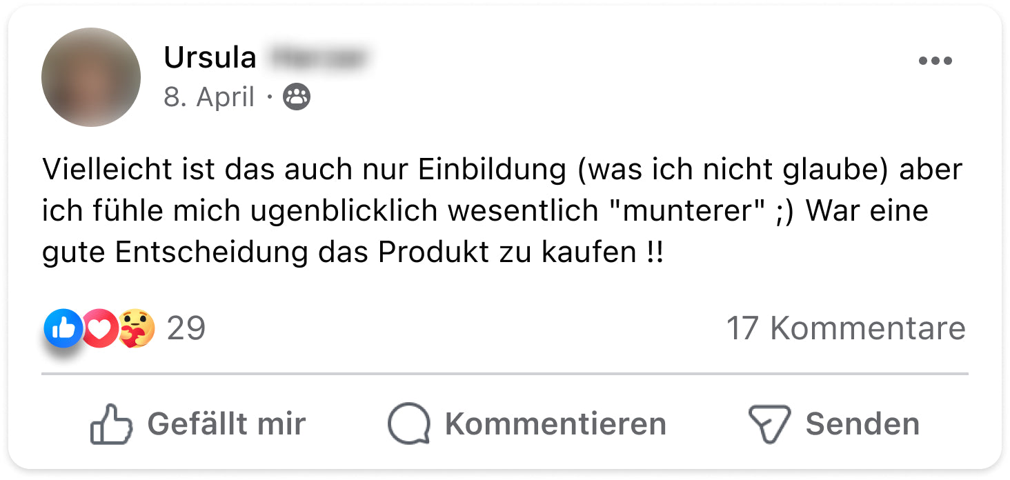 Disclaimer: Dieses Produkt ist nicht zur Diagnose, Behandlung, Heilung von oder zur Vorbeuge vor Krankheiten bestimmt. Die Ergebnisse können variieren / sind eventuell nicht typisch. Bewertungen oder Testimonials sind individuelle Erfahrungsberichte unserer Kunden. Diese Informationen stellen keine medizinische Beratung dar und dürfen auch nicht als eine solche verstanden werden. Sprich bitte mit deinem Arzt, bevor du dein regelmäßiges, ärztlich vorgeschriebenes Behandlungsverfahren änderst. Nahrungsergänzungsmittel sind kein Ersatz für eine ausgewogene und abwechslungsreiche Ernährung und eine gesunde Lebensweise. Das Bildmaterial unserer Kundenfeedbacks wurde aus Gründen des Persönlichkeitsrechts z.T. lizensiert erworben und entspricht nicht immer dem echten Erscheinungsbild.